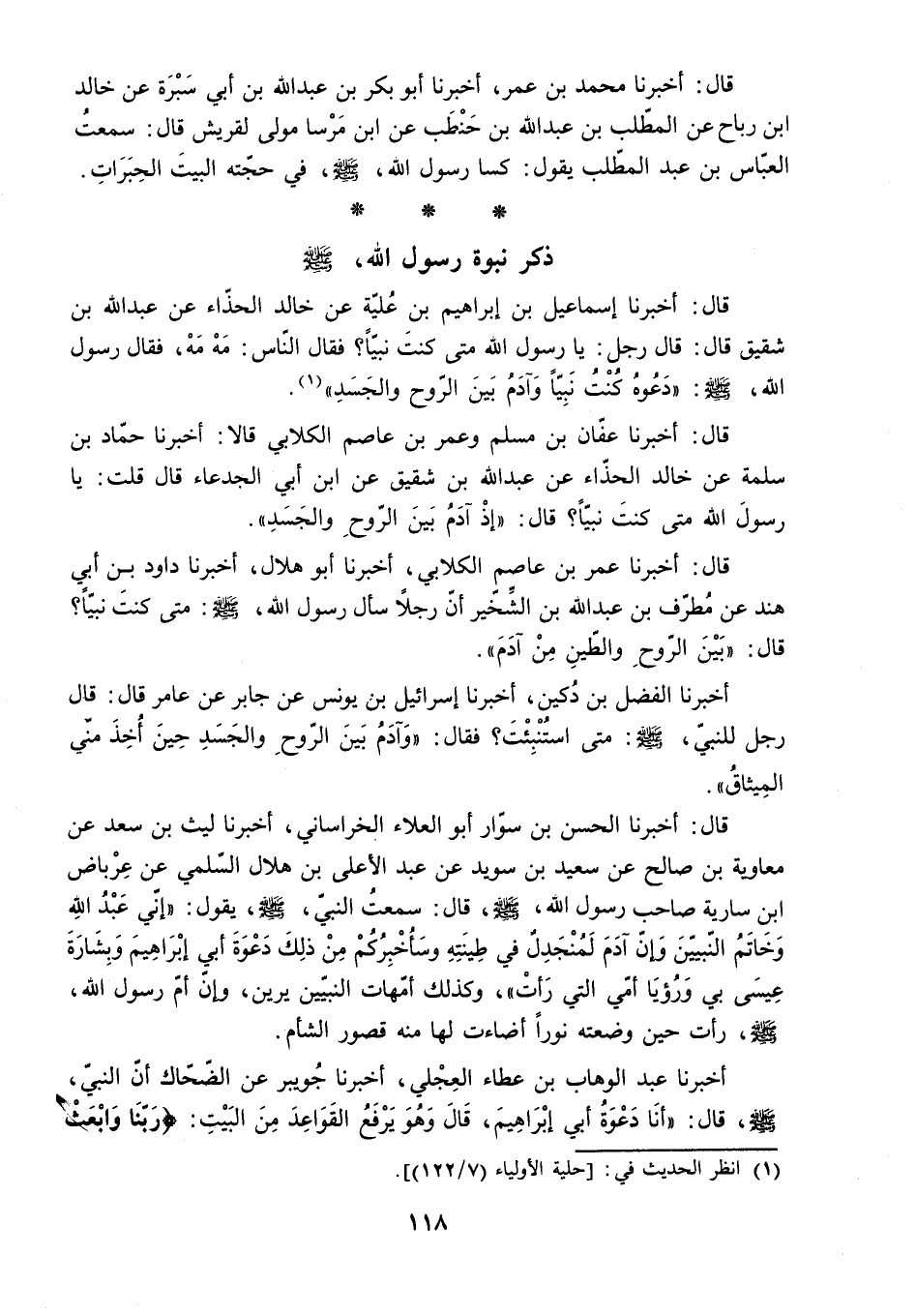 قَالَ: أَخْبَرَنَا الْحَسَنُ بن سوار أبو العلاء الخراساني. أخبرنا ليث بْنُ سَعْدٍ عَنْ مُعَاوِيَةَ بْنِ صَالِحٍ عَنْ سَعِيدِ بْنِ سُوَيْدٍ عَنْ عَبْدِ الأَعْلَى بْنِ هلال السلمي عن عرباض ابن سَارِيَةَ صَاحِبِ رَسُولِ اللَّهِ - صَلَّى اللَّهُ عَلَيْهِ وَسَلَّمَ - قَالَ: [سَمِعْتُ النَّبِيَّ - صَلَّى اللَّهُ عَلَيْهِ وَسَلَّمَ - يَقُولُ: إِنِّي عَبْدُ اللَّهِ وَخَاتَمُ النَّبِيِّينَ وَإِنَّ آدَمَ لَمُنْجَدِلٌ فِي طِينَتِهِ وَسَأُخْبِرُكُمْ مِنْ ذَلِكَ دَعْوَةَ أَبِي إِبْرَاهِيمَ وَبِشَارَةَ عِيسَى بِي وَرُؤْيَا أُمِّي الَّتِي رَأَتْ] . وَكَذَلِكَ أُمَّهَاتُ النَّبِيِّينَ يرين. وإن أم رسول الله.