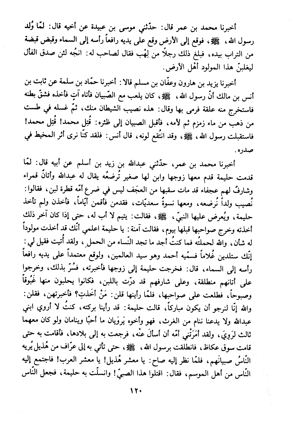 وَاللَّهِ إِنَّا لَنَرْجُو أَنْ يَكُونَ مُبَارَكًا. قَالَتْ حَلِيمَةُ: قَدْ رَأَيْنَا بَرَكَتَهُ. كُنْتُ لا أَرْوِي ابْنِي عَبْدَ اللَّهِ وَلا يَدَعُنَا نَنَامُ مِنَ الْغَرَثِ. فَهُوَ وَأَخُوهُ يَرْوَيَانِ مَا أَحَبَّا وَيَنَامَانِ وَلَوْ كَانَ مَعَهُمَا ثَالِثٌ لَرَوِيَ. وَلَقَدْ أَمَرَتْنِي أُمُّهُ أَنْ أَسْأَلَ عَنْهُ. فَرَجَعَتْ بِهِ إِلَى بِلادِهَا. فَأَقَامَتْ بِهِ حَتَّى قَامَتْ سُوقُ عُكَاظٍ. فَانْطَلَقَتْ بِرَسُولِ اللَّهِ - صَلَّى اللَّهُ عَلَيْهِ وَسَلَّمَ - حَتَّى تَأْتِيَ بِهِ إِلَى عَرَّافٍ مِنْ هُذَيْلٍ يُرِيهُ النَّاسُ صِبْيَانَهُمْ. فَلَمَّا نَظَرَ إِلَيْهِ صَاحَ: يَا مَعْشَرَ هُذَيْلٍ! يَا مَعْشَرَ الْعَرَبِ! فَاجْتَمَعَ إِلَيْهِ النَّاسُ مِنْ أَهْلِ الْمَوْسِمِ. فَقَالَ: اقْتُلُوا هَذَا الصَّبِيَّ! وَانْسَلَّتْ بِهِ حَلِيمَةُ. فَجَعَلَ النَّاسُ