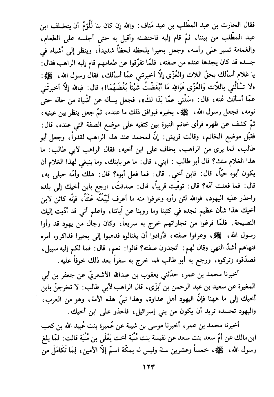 قَالَ: فَمَا فَعَلَتْ أُمُّهُ؟ قَالَ: تُوُفِّيَتْ قَرِيبًا. قَالَ: صَدَقْتَ. ارْجِعْ بِابْنِ أَخِيكَ إلى بلده واحذر عليه اليهود. فو الله لَئِنْ رَأَوْهُ وَعَرَفُوا مِنْهُ مَا أَعْرِفُ لَيَبْغُنَّهُ عَنَتًا. فَإِنَّهُ كَائِنٌ لابْنِ أَخِيكَ هَذَا شَأْنٌ عَظِيمٌ نَجِدُهُ فِي كُتُبِنَا وَمَا رُوِّينَا عَنْ آبَائِنَا. وَأَعْلَمُ أَنِّي قَدْ أَدَّيْتُ إِلَيْكَ النَّصِيحَةَ. فَلَمَّا فَرَغُوا مِنْ تِجَارَاتِهِمْ خَرَجَ بِهِ سَرِيعًا. وَكَانَ رِجَالٌ مِنْ يَهُودَ قَدْ رَأَوْا رَسُولَ اللَّهِ - صَلَّى اللَّهُ عَلَيْهِ وَسَلَّمَ - وَعَرَفُوا صِفَتَهُ. فَأَرَادُوا أَنْ يَغْتَالُوهُ فَذَهَبُوا إِلَى بَحِيرَا فَذَاكَرُوهُ أَمْرَهُ فَنَهَاهُمْ أَشَدَّ النَّهْيِ وَقَالَ لَهُمْ: أَتَجِدُونَ صِفَتَهُ؟ قَالُوا: نَعَمْ. قَالَ: فَمَا لَكُمْ إِلَيْهِ سَبِيلٌ.