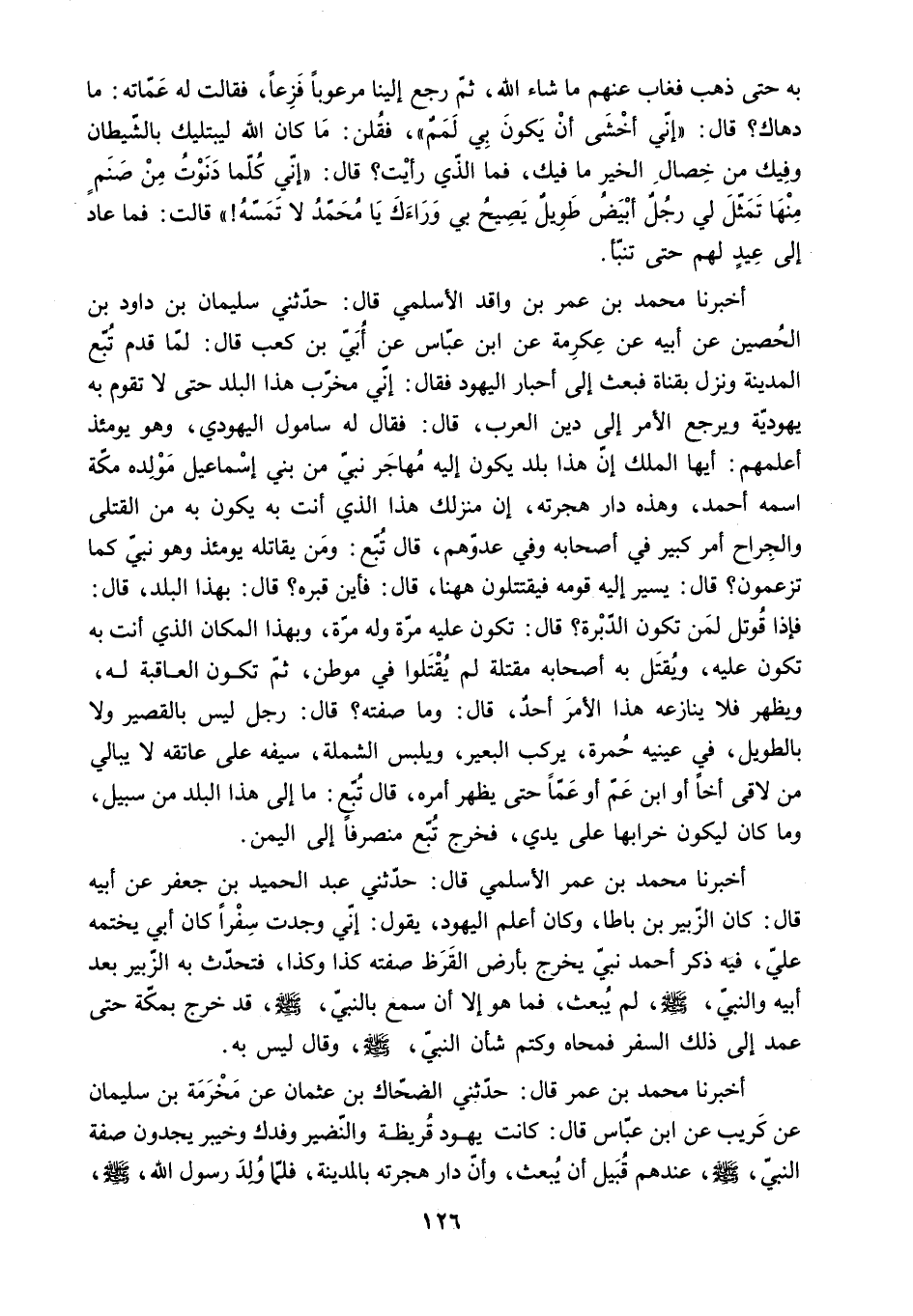 بِهِ حَتَّى ذَهَبَ فَغَابَ عَنْهُمْ مَا شَاءَ اللَّهُ. ثُمَّ رَجَعَ إِلَيْنَا مَرْعُوبًا فَزِعًا. فَقَالَتْ لَهُ عَمَّاتُهُ: مَا دَهَاكَ؟ قَالَ: إِنِّي أَخْشَى أَنْ يَكُونَ بِي لَمَمٌ. فَقُلْنَ: مَا كَانَ اللَّهُ لِيَبْتَلِيَكَ بِالشَّيْطَانِ [وَفِيكَ مِنْ خِصَالِ الْخَيْرِ مَا فِيكَ. فَمَا الَّذِي رَأَيْتَ؟ قَالَ: إِنِّي كُلَّمَا دَنَوْتُ مِنْ صَنَمٍ مِنْهَا تَمَثَّلَ لِي رَجُلٌ أَبْيَضُ طَوِيلٌ يَصِيحُ بِي وَرَاءَكَ يَا مُحَمَّدُ لا تَمَسَّهُ! قَالَتْ: فَمَا عَادَ إِلَى عِيدٍ لَهُمْ حَتَّى تَنَبَّأَ.] أَخْبَرَنَا مُحَمَّدُ بْنُ عُمَرَ بْنِ وَاقِدٍ الأَسْلَمِيُّ قَالَ: حَدَّثَنِي سُلَيْمَانُ بْنُ دَاوُدَ بْنِ الْحُصَيْنِ عَنْ أَبِيهِ عَنْ عِكْرِمَةَ عَنِ ابْنِ عَبَّاسٍ عَنْ أُبَيِّ بْنِ كَعْبٍ قَالَ: لَمَّا قَدِمَ تُبَّعٌ الْمَدِينَةَ وَنَزَلَ بِقَنَاةٍ فَبَعَثَ إِلَى أَحْبَارِ الْيَهُودِ فَقَالَ: إِنِّي مُخَرِّبٌ هَذَا الْبَلَدَ حَتَّى لا تَقُومَ بِهِ يَهُودِيَّةٌ وَيَرْجِعَ الأَمْرُ إِلَى دِينِ الْعَرَبِ. قَالَ: فَقَالَ لَهُ سَامُولُ الْيَهُودِيُّ. وَهُوَ يَوْمَئِذٍ أَعْلَمُهُمْ: أَيُّهَا الْمَلِكُ إِنَّ هَذَا بَلَدٌ يَكُونُ إِلَيْهِ مُهَاجَرُ نَبِيٍّ مِنْ بَنِي إِسْمَاعِيلَ مَوْلِدُهُ مَكَّةُ اسْمُهُ أَحْمَدُ. وَهَذِهِ دَارُ هِجْرَتِهِ. إِنَّ مَنْزِلَكَ هَذَا الَّذِي أَنْتَ بِهِ يَكُونُ بِهِ مِنَ الْقَتْلَى وَالْجِرَاحِ أَمْرٌ كَبِيرٌ فِي أَصْحَابِهِ وَفِي عَدُوِّهِمْ. قَالَ تُبَّعٌ: وَمَنْ يُقَاتِلُهُ يَوْمَئِذٍ وَهُوَ نَبِيٌّ كَمَا تَزْعُمُونَ؟ قَالَ: يَسِيرُ إِلَيْهِ قَوْمُهُ فَيَقْتَتِلُونَ هَهُنَا. قَالَ: فَأَيْنَ قَبْرُهُ؟ قَالَ: بِهَذَا الْبَلَدِ. قَالَ: