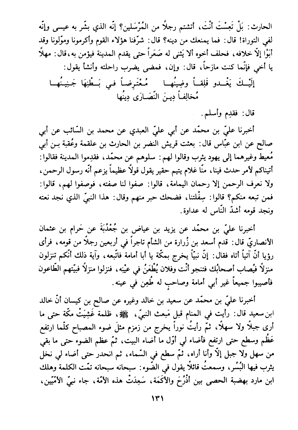 أَخْبَرَنَا عَلِيُّ بْنُ مُحَمَّدٍ عَنْ سَعِيدِ بْنِ خَالِدٍ وَغَيْرِهِ عَنْ صَالِحِ بْنِ كَيْسَانَ أَنَّ خَالِدَ ابن سَعِيدٍ قَالَ: رَأَيْتُ فِي الْمَنَامِ قَبْلَ مَبْعَثِ النَّبِيِّ - صَلَّى اللَّهُ عَلَيْهِ وَسَلَّمَ - ظُلْمَةً غَشِيَتْ مَكَّةَ حَتَّى مَا أَرَى جَبَلا وَلا سَهْلا. ثُمَّ رَأَيْتُ نُورًا يَخْرُجُ مِنْ زَمْزَمَ مِثْلَ ضَوْءِ الْمِصْبَاحِ كُلَّمَا ارْتَفَعَ عَظُمَ وَسَطَعَ حَتَّى ارْتَفَعَ فَأَضَاءَ لِي أَوَّلَ مَا أَضَاءَ الْبَيْتَ. ثُمَّ عَظُمَ الضَّوْءُ حَتَّى مَا بَقِيَ مِنْ سَهْلٍ وَلا جَبَلٍ إِلا وَأَنَا أَرَاهُ. ثُمَّ سَطَعَ فِي السَّمَاءِ. ثُمَّ انْحَدَرَ حَتَّى أَضَاءَ لِي نَخْلَ يَثْرِبَ فِيهَا الْبُسُرُ. وَسَمِعْتُ قَائِلا يَقُولُ فِي الضَّوْءِ: سُبْحَانَهُ سُبْحَانَهُ تَمَّتِ الْكَلِمَةُ وَهَلَكَ ابْنُ مَارِدٍ بِهَضَبَةِ الْحَصَى بَيْنَ أَذْرُحَ وَالأَكَمَةِ. سَعِدَتْ هَذِهِ الأُمَّةُ. جَاءَ نَبِيُّ الأُمِّيِّينَ.