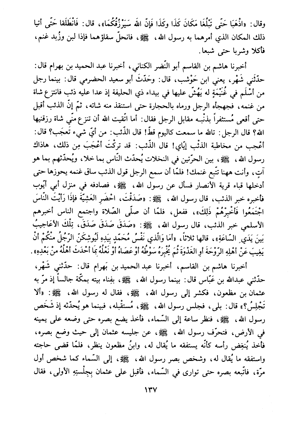 حَدَّثَنِي شَهْرٌ. يَعْنِي ابْنَ حَوْشَبٍ. قَالَ: وَحَدَّثَ أَبُو سَعِيدٍ الْحَضْرَمِيُّ قَالَ: بَيْنَمَا رَجُلٌ مِنْ أَسْلَمَ فِي غَنِيمَةٍ لَهُ يَهُشُّ عَلَيْهَا فِي بَيْدَاءِ ذِي الْحُلَيْفَةِ إِذْ عَدَا عَلَيْهِ ذِئْبٌ فَانْتَزَعَ شَاةً مِنْ غَنَمِهِ. فَجَهْجَأَهُ الرَّجُلُ وَرَمَاهُ بِالْحِجَارَةِ حَتَّى اسْتَنْقَذَ مِنْهُ شَاتَهُ. ثُمَّ إِنَّ الذِّئْبَ أَقْبَلَ حَتَّى أَقْعَى مُسْتَثْفِرًا بِذَنَبِهِ مُقَابِلَ الرَّجُلِ فَقَالَ: أَمَا اتَّقَيْتَ اللَّهَ أَنْ تَنْزِعَ مِنِّي شَاةً رَزَقْنِيهَا اللَّهُ؟ قَالَ الرَّجُلُ: تَالَلَّهِ مَا سَمِعْتُ كَالْيَوْمِ قَطُّ! قَالَ الذِّئْبُ: مِنْ أَيِّ شَيْءٍ تَعْجَبُ؟ قَالَ: