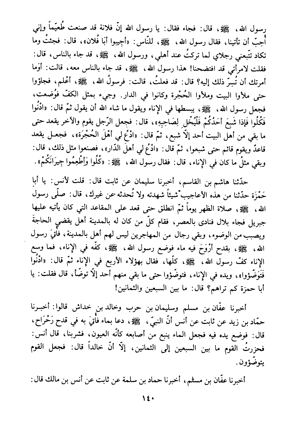 [حَدَّثَنَا هَاشِمُ بْنُ الْقَاسِمِ. أَخْبَرَنَا سُلَيْمَانُ عَنْ ثَابِتٍ قَالَ: قُلْتُ لأَنَسٍ: يَا أَبَا حَمْزَةَ حَدِّثْنَا مِنْ هَذِهِ الأَعَاجِيبِ شَيْئًا شَهِدْتَهُ وَلا تُحَدِّثْهُ عَنْ غَيْرِكَ. قَالَ: صَلَّى رَسُولُ اللَّهِ - صَلَّى اللَّهُ عَلَيْهِ وسلم - صَلاةَ الظُّهْرِ يَوْمًا ثُمَّ انْطَلَقَ حَتَّى قَعَدَ عَلَى الْمَقَاعِدِ الَّتِي كَانَ يَأْتِيهِ عَلَيْهَا جِبْرِيلُ فَجَاءَ بِلالٌ فَنَادَى بِالْعَصْرِ. فَقَامَ كُلُّ مَنْ كان له بالمدينة أهل يقضي الحاجة ويصبب مِنَ الْوَضُوءِ. وَبَقِيَ رِجَالٌ مِنَ الْمُهَاجِرِينِ لَيْسَ لَهُمْ أَهْلٌ بِالْمَدِينَةِ. فَأُتِيَ رَسُولُ اللَّهِ - صَلَّى اللَّهُ عَلَيْهِ وَسَلَّمَ - بِقَدَحٍ أَرْوَحَ فِيهِ مَاءٌ فَوَضَعَ رَسُولُ اللَّهِ - صَلَّى اللَّهُ عَلَيْهِ وَسَلَّمَ - كَفَّهُ فِي الإِنَاءِ. فَمَا وَسِعَ الإِنَاءُ كَفَّ رَسُولِ اللَّهِ - صَلَّى اللَّهُ عَلَيْهِ وَسَلَّمَ - كُلَّهَا. فَقَالَ بِهَؤُلاءِ الأَرْبَعِ فِي الإِنَاءِ ثُمَّ قَالَ: ادنوا فتوضأوا. ويده في الإناء. فتوضأوا حَتَّى مَا بَقِيَ مِنْهُمْ أَحَدٌ إِلا تَوَضَّأَ. قَالَ فَقُلْتُ: يَا أَبَا حَمْزَةَ كَمْ تُرَاهُمْ؟ قَالَ: مَا بَيْنَ السَّبْعِينَ وَالثَّمَانِينَ!] أَخْبَرَنَا عَفَّانُ بْنُ مُسْلِمٍ وَسُلَيْمَانُ بْنُ حَرْبٍ وَخَالِدُ بْنُ خِدَاشٍ قَالُوا: أَخْبَرَنَا حَمَّادُ بْنُ زَيْدٍ عَنْ ثَابِتٍ عَنْ أَنَسٍ أَنَّ النَّبِيَّ - صَلَّى اللَّهُ عَلَيْهِ وَسَلَّمَ - دَعَا بِمَاءٍ فَأُتِيَ بِهِ فِي قَدَحٍ رَحْرَاحٍ.