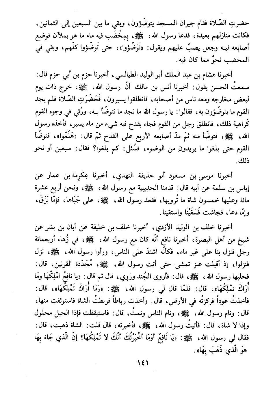سَمِعْتُ الْحَسَنَ يَقُولُ: أَخْبَرَنَا أَنَسُ بْنُ مَالِكٍ أَنَّ رَسُولَ اللَّهِ - صَلَّى اللَّهُ عَلَيْهِ وَسَلَّمَ - خَرَجَ ذَاتَ يَوْمٍ لِبَعْضِ مَخَارِجِهِ وَمَعَهُ نَاسٌ مِنْ أَصْحَابِهِ. فَانْطَلَقُوا يَسِيرُونَ. فَحَضَرَتِ الصَّلاةُ فَلَمْ يَجِدِ الْقَوْمُ ما يتوضؤون بِهِ. فَقَالُوا: يَا رَسُولَ اللَّهِ مَا نَجِدُ مَا نَتَوَضَّأُ بِهِ. وَرُئِيَ فِي وُجُوهِ الْقَوْمِ كَرَاهِيَةَ ذَلِكَ. فَانْطَلَقَ رَجُلٌ مِنَ الْقَوْمِ فَجَاءَ بِقَدَحٍ فِيهِ شَيْءٌ مِنْ مَاءٍ يَسِيرٍ. فَأَخَذَهُ رَسُولُ اللَّهِ - صَلَّى اللَّهُ عَلَيْهِ وَسَلَّمَ - فَتَوَضَّأَ مِنْهُ ثُمَّ مَدَّ أَصَابِعَهُ الأَرْبَعَ عَلَى الْقَدَحِ ثُمَّ قَالَ: هَلُمُّوا. فَتَوَضَّأَ الْقَوْمُ حَتَّى بَلَغُوا مَا يُرِيدُونَ مِنَ الْوضُوءِ. فَسُئِلَ: كَمْ بَلَغُوا؟ فَقَالَ: سَبْعِينَ أَوْ نَحْوَ ذَلِكَ] .