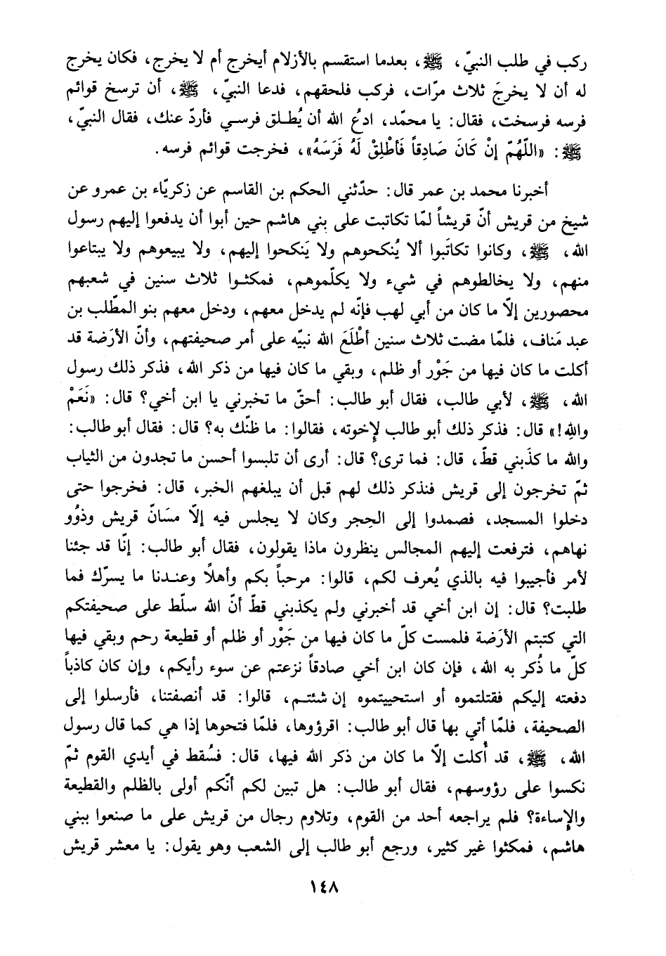 أَخْبَرَنَا مُحَمَّدُ بْنُ عُمَرَ قَالَ: حَدَّثَنِي الْحَكَمُ بْنُ الْقَاسِمِ عَنْ زَكَرِيَّاءَ بْنِ عَمْرٍو عَنْ شَيْخٍ مِنْ قُرَيْشٍ أَنَّ قُرَيْشًا لَمَّا تَكَاتَبَتْ عَلَى بَنِي هَاشِمٍ حِينَ أَبَوْا أَنْ يَدْفَعُوا إِلَيْهِمْ رَسُولَ اللَّهِ - صَلَّى اللَّهُ عَلَيْهِ وَسَلَّمَ - وَكَانُوا تَكَاتَبُوا أَلا يُنْكِحُوهُمْ وَلا يَنْكِحُوا إِلَيْهِمْ. وَلا يَبِيعُوهُمْ وَلا يَبْتَاعُوا مِنْهُمْ. وَلا يُخَالِطُوهُمْ فِي شَيْءٍ وَلا يُكَلِّمُوهُمْ. فَمَكَثُوا ثَلاثَ سِنِينَ فِي شِعْبِهِمْ مَحْصُورِينَ إِلا مَا كَانَ مِنْ أَبِي لَهَبٍ فَإِنَّهُ لَمْ يَدْخُلْ مَعَهُمْ. وَدَخَلَ مَعَهُمْ بَنُو الْمُطَّلِبِ بْنِ عَبْدِ مَنَافٍ. فَلَمَّا مَضَتْ ثَلاثُ سِنِينَ أَطْلَعُ اللَّهُ نَبِيَّهُ عَلَى أَمْرِ صَحِيفَتِهِمْ. وَأَنَّ الأَرَضَةَ قَدْ أَكَلَتْ مَا كَانَ فِيهَا مِنْ جَوْرٍ أَوْ ظُلْمٍ. وَبَقِيَ مَا كَانَ فِيهَا مِنْ ذِكْرِ اللَّهِ. فَذَكَرَ ذَلِكَ رَسُولُ اللَّهِ - صَلَّى اللَّهُ عَلَيْهِ وَسَلَّمَ - لأَبِي طَالِبٍ. فَقَالَ أَبُو طَالِبٍ: أَحَقٌّ مَا تُخْبِرُنِي يَا ابْنَ أَخِي؟ قَالَ: نَعَمْ وَاللَّهِ! قَالَ: فَذَكَرَ ذَلِكَ أَبُو طالب لإخوته. فقالوا: مَا ظَنُّكَ بِهِ؟ قَالَ: فَقَالَ أَبُو طَالِبٍ: