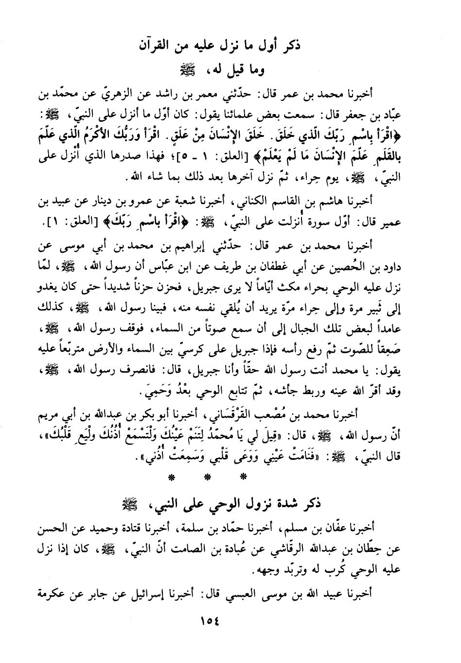 أَخْبَرَنَا هَاشِمُ بْنُ الْقَاسِمِ الْكِنَانِيُّ. أَخْبَرَنَا شُعْبَةُ عَنْ عَمْرِو بْنِ دِينَارٍ عَنْ عُبَيْدِ بْنِ عُمَيْرٍ قال: أول سورة أنزلت على النبي. ص: «اقْرَأْ بِاسْمِ رَبِّكَ» العلق: 1.