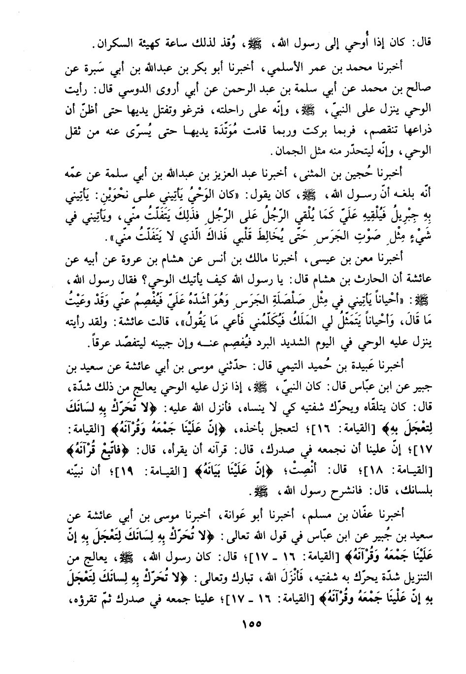 » القيامة: 16- 17. قَالَ: كَانَ رَسُولُ اللَّهِ - صَلَّى اللَّهُ عَلَيْهِ وَسَلَّمَ - يُعَالِجُ مِنَ التَّنْزِيلِ شِدَّةً يُحَرِّكُ بِهِ شَفَتَيْهِ. فَأَنْزَلَ اللَّهُ. تَبَارَكَ وَتَعَالَى: «لا تُحَرِّكْ بِهِ لِسانَكَ لِتَعْجَلَ بِهِ إِنَّ عَلَيْنا جَمْعَهُ وَقُرْآنَهُ