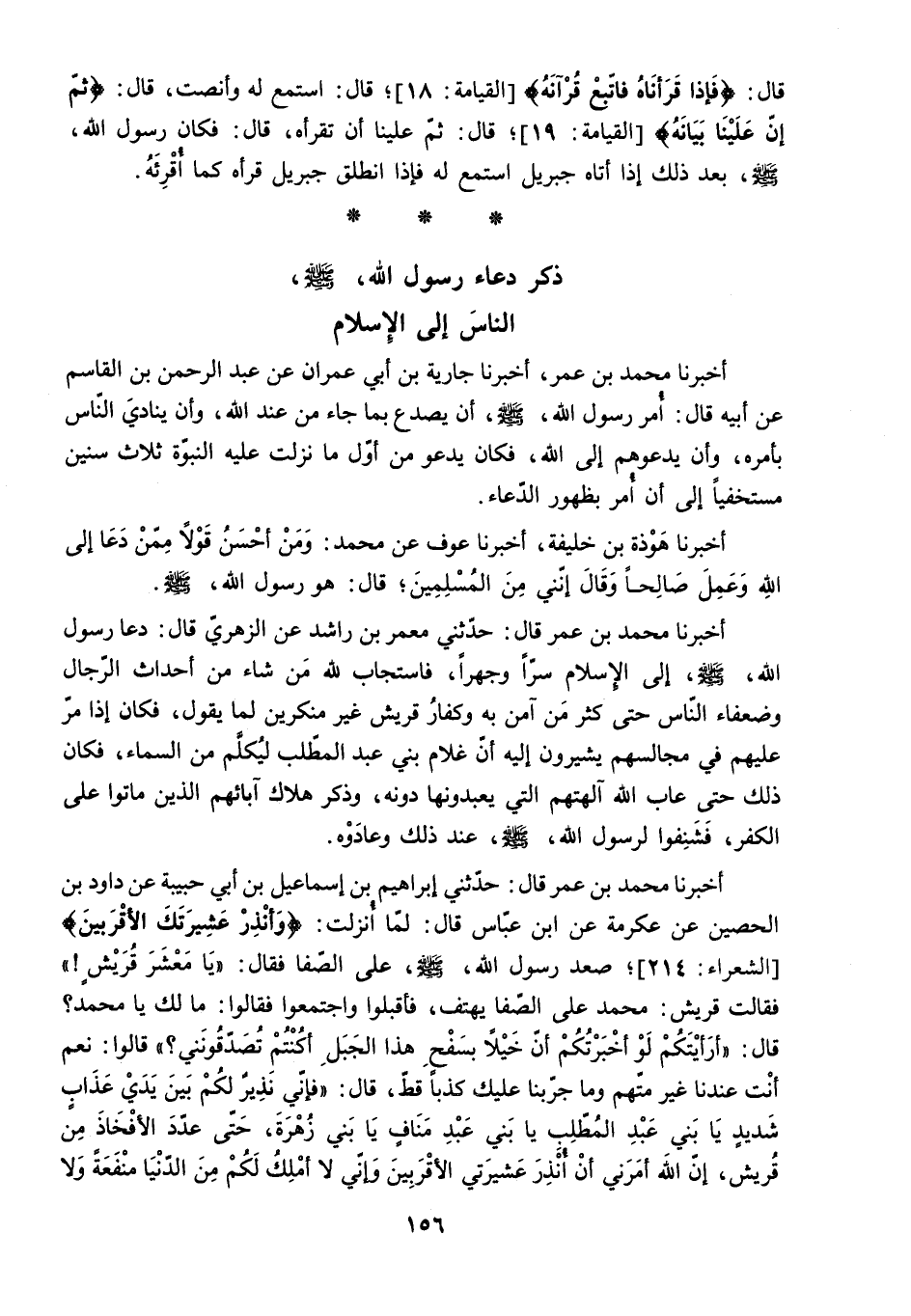 أَخْبَرَنَا مُحَمَّدُ بْنُ عُمَرَ قَالَ: حَدَّثَنِي مَعْمَرُ بْنُ رَاشِدٍ عَنِ الزُّهْرِيِّ قَالَ: دَعَا رَسُولُ اللَّهِ - صَلَّى اللَّهُ عَلَيْهِ وَسَلَّمَ - إلى الإِسْلامِ سِرًّا وَجَهْرًا. فَاسْتَجَابَ لِلَّهِ مَنْ شَاءَ مِنْ أَحْدَاثِ الرِّجَالِ وَضُعَفَاءِ النَّاسِ حَتَّى كَثُرَ مَنْ آمَنَ بِهِ وَكُفَّارُ قُرَيْشٍ غَيْرُ مُنْكِرِينَ لِمَا يَقُولُ. فَكَانَ إِذَا مَرَّ عَلَيْهِمْ فِي مَجَالِسِهِمْ يُشِيرُونَ إِلَيْهِ أَنَّ غُلامَ بَنِي عَبْدِ الْمُطَّلِبِ لَيُكَلَّمُ مِنَ السَّمَاءِ. فَكَانَ ذَلِكَ حَتَّى عَابَ اللَّهُ آلِهَتَهُمُ الَّتِي يَعْبُدُونَهَا دُونَهُ. وَذَكَرَ هَلاكَ آبَائِهِمُ الَّذِينَ مَاتُوا عَلَى الْكُفْرِ. فَشَنِفُوا لِرَسُولِ اللَّهِ - صَلَّى اللَّهُ عَلَيْهِ وَسَلَّمَ - عِنْدَ ذَلِكَ وَعَادَوْهُ.