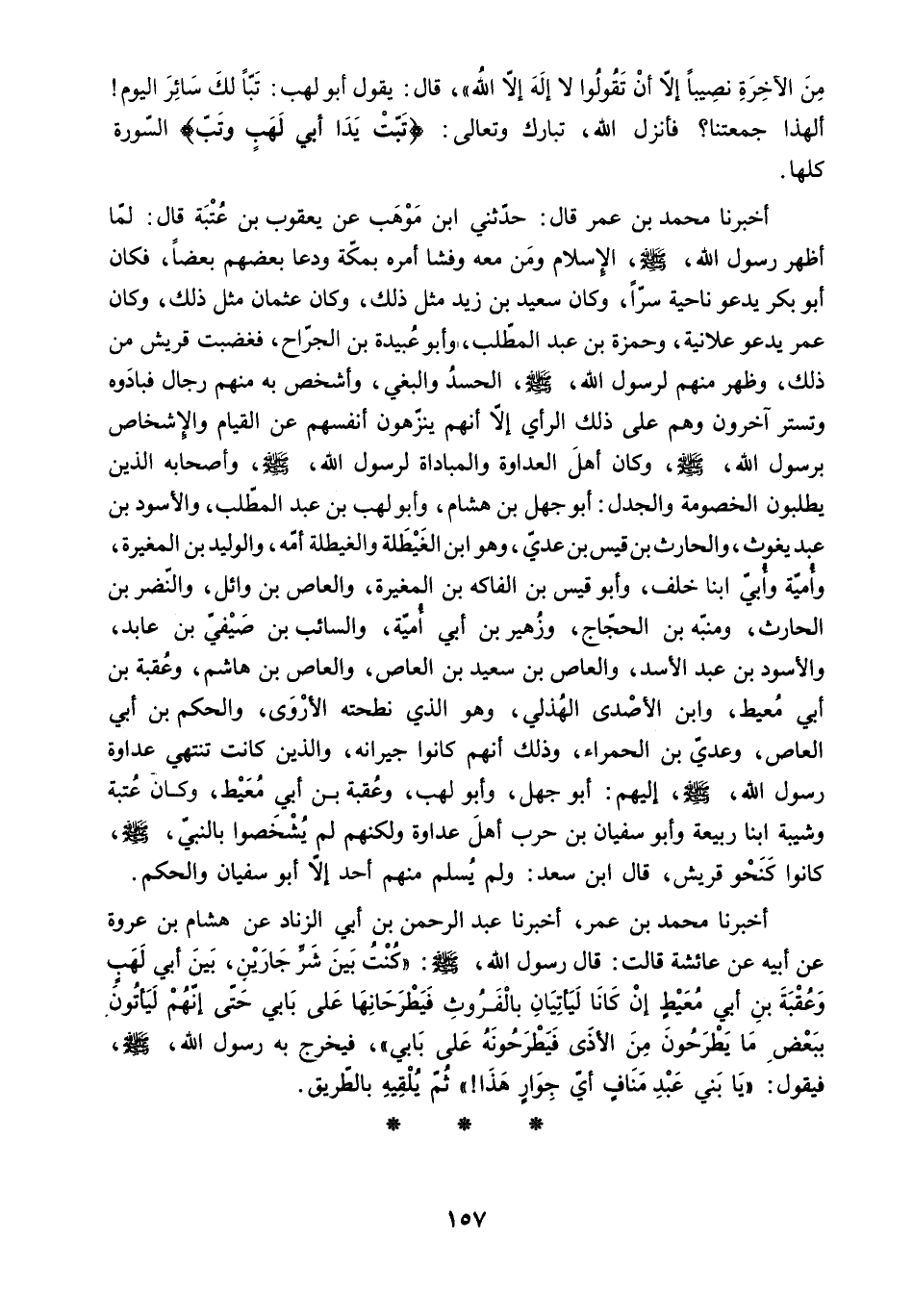 أَخْبَرَنَا مُحَمَّدُ بْنُ عُمَرَ قَالَ: حَدَّثَنِي ابْنُ مَوْهَبٍ عَنْ يَعْقُوبَ بْنِ عُتْبَةَ قَالَ: لَمَّا أَظْهَرَ رَسُولُ اللَّهِ - صَلَّى اللَّهُ عَلَيْهِ وَسَلَّمَ - الإِسْلامَ وَمَنْ مَعَهُ وَفَشَا أَمْرُهُ بِمَكَّةَ وَدَعَا بَعْضُهُمْ بَعْضًا. فَكَانَ أَبُو بَكْرٍ يَدْعُو نَاحِيَةً سِرًّا. وَكَانَ سَعِيدُ بْنُ زَيْدٍ مِثْلَ ذَلِكَ. وَكَانَ عُثْمَانُ مِثْلَ ذَلِكَ. وَكَانَ عُمَرُ يَدْعُو عَلانِيَةً. وَحَمْزَةُ بْنُ عَبْدِ الْمُطَّلِبِ. وَأَبُو عُبَيْدَةَ بْنُ الْجَرَّاحِ. فَغَضِبَتْ قُرَيْشٌ مِنْ ذَلِكَ. وَظَهَرَ مِنْهُمْ لِرَسُولِ اللَّهِ - صَلَّى اللَّهُ عَلَيْهِ وَسَلَّمَ - الْحَسَدُ وَالْبَغْيُ. وَأَشْخَصَ بِهِ مِنْهُمْ رِجَالٌ فَبَادَوْهُ وَتَسَتَّرَ آخَرُونَ وَهُمْ عَلَى ذَلِكَ الرَّأْيِ إِلا أَنَّهُمْ يُنَزِّهُونَ أَنْفُسَهُمْ عَنِ الْقِيَامِ وَالإِشْخَاصِ بِرَسُولِ اللَّهِ - صَلَّى اللَّهُ عَلَيْهِ وَسَلَّمَ - وَكَانَ أَهْلَ الْعَدَاوَةِ وَالْمُبَادَاةِ لِرَسُولِ اللَّهِ - صَلَّى اللَّهُ عَلَيْهِ وَسَلَّمَ - وَأَصْحَابِهِ الَّذِينَ يَطْلُبُونَ الْخُصُومَةَ وَالْجَدَلَ: أَبُو جَهْلِ بْنُ هِشَامٍ. وَأَبُو لَهَبِ بْنُ عَبْدِ الْمُطَّلِبِ. وَالأَسْوَدُ بْنُ عَبْدِ يَغُوثَ. وَالْحَارِثُ بْنُ قَيْسِ بْنِ عَدِيٍّ. وَهُوَ ابْنُ الْغَيْطَلَةِ وَالْغَيْطَلَةُ أُمُّهُ. وَالْوَلِيدُ بْنُ الْمُغِيرَةِ.