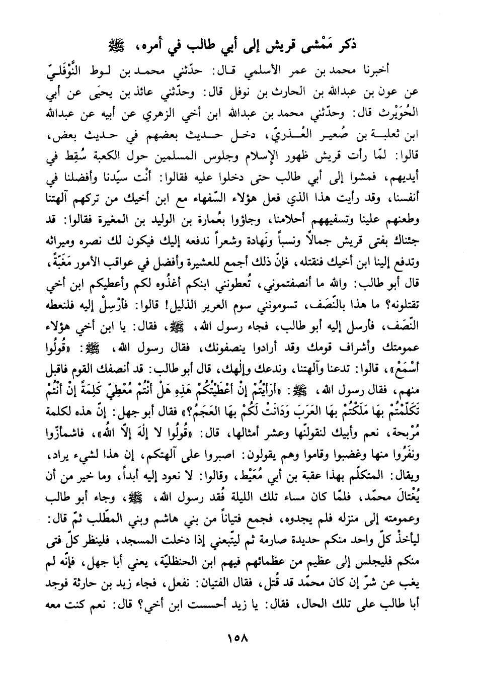 قَالَ أَبُو طَالِبٍ: وَاللَّهِ مَا أَنْصَفْتُمُونِي. تُعْطُونَنِي ابْنَكُمْ أَغْذُوهُ لَكُمْ وَأُعْطِيكُمُ ابْنَ أَخِي تَقْتُلُونَهُ؟ مَا هَذَا بِالنَّصَفِ. تَسُومُونَنِي سَوْمَ الْعَرِيرِ الذَّلِيلِ! قَالُوا: فَأَرْسِلْ إِلَيْهِ فَلْنُعْطِهِ النَّصَفَ. فَأَرْسَلَ إِلَيْهِ أَبُو طَالِبٍ. فَجَاءَ رَسُولُ اللَّهِ - صَلَّى اللَّهُ عَلَيْهِ وَسَلَّمَ - فَقَالَ: يَا ابْنَ أَخِي هَؤُلاءِ عُمُومَتُكَ وَأَشْرَافُ قَوْمِكَ وَقَدْ أَرَادُوا يُنْصِفُونَكَ. [فَقَالَ رَسُولُ الله. ص: قُولُوا أَسْمَعْ. قَالُوا: تَدَعَنَا وَآلِهَتَنَا. وَنَدَعُكَ وَإِلَهَكَ. قَالَ أَبُو طَالِبٍ: قَدْ أَنْصَفَكَ الْقَوْمُ فَاقْبَلْ منهم. فقال رسول الله. ص: أَرَأَيْتُمْ إِنْ أَعْطَيْتُكُمْ هَذِهِ هَلْ أَنْتُمْ مُعْطِيَّ كَلِمَةً إِنْ أَنْتُمْ تَكَلَّمْتُمْ بِهَا مَلَكْتُمْ بِهَا الْعَرَبَ وَدَانَتْ لَكُمْ بِهَا الْعَجَمُ؟ فَقَالَ أَبُو جَهْلٍ: إِنَّ هَذِهِ لَكَلِمَةٌ مُرْبِحَةٌ. نَعَمْ وَأَبِيكَ لَنَقُولَنَّهَا وَعَشَرَ أَمْثَالِهَا. قَالَ: قُولُوا لا إِلَهَ إِلا اللَّهُ. فَاشْمَأَزُّوا] وَنَفَرُوا مِنْهَا وَغَضِبُوا وَقَامُوا وَهُمْ يَقُولُونَ: اصْبِرُوا عَلَى آلِهَتِكُمْ. إِنَّ هَذَا لِشَيْءٌ يُرَادُ.