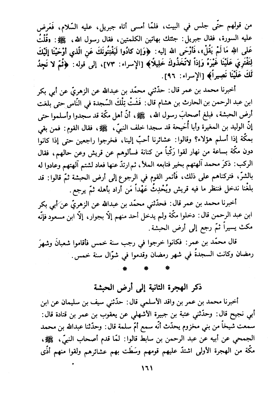 أَخْبَرَنَا مُحَمَّدُ بْنُ عُمَرَ قَالَ: حَدَّثَنِي مُحَمَّدُ بْنُ عَبْدِ اللَّهِ عَنِ الزُّهْرِيِّ عَنْ أَبِي بكر ابن عَبْدِ الرَّحْمَنِ بْنِ الْحَارِثِ بْنِ هِشَامٍ قَالَ: فَشَتْ تِلْكَ السَّجْدَةُ فِي النَّاسِ حَتَّى بَلَغَتْ أَرْضَ الْحَبَشَةِ. فَبَلَغَ أَصْحَابَ رَسُولِ اللَّهِ - صَلَّى اللَّهُ عَلَيْهِ وَسَلَّمَ - أَنَّ أَهْلَ مَكَّةَ قَدْ سَجَدُوا وَأَسْلَمُوا حَتَّى إِنَّ الْوَلِيدَ بْنَ الْمُغِيرَةِ وَأَبَا أُحَيْحَةَ قَدْ سَجَدَا خَلْفَ النَّبِيِّ - صَلَّى اللَّهُ عَلَيْهِ وَسَلَّمَ - فَقَالَ الْقَوْمُ: فَمَنْ بَقِيَ بِمَكَّةَ إِذَا أَسْلَمَ هَؤُلاءِ؟ وَقَالُوا: عَشَائِرُنَا أَحَبُّ إِلَيْنَا. فَخَرَجُوا رَاجِعِينَ حَتَّى إِذَا كَانُوا دُونَ مَكَّةَ بِسَاعَةٍ مِنْ نَهَارٍ لَقُوا رَكْبًا مِنْ كِنَانَةَ فَسَأَلُوهُمْ عَنْ قُرَيْشٍ وَعَنْ حَالِهِمْ. فَقَالَ الرَّكْبُ: ذَكَرَ مُحَمَّدٌ آلِهَتَهُمْ بِخَيْرٍ فَتَابَعَهُ الْمَلأُ. ثُمَّ ارْتَدَّ عَنْهَا فَعَادَ لِشَتْمِ آلِهَتِهِمْ وَعَادُوا لَهُ بِالشَّرِّ. فَتَرَكْنَاهُمْ عَلَى ذَلِكَ. فَأْتَمَرَ الْقَوْمُ فِي الرُّجُوعِ إِلَى أَرْضِ الْحَبَشَةِ ثُمَّ قَالُوا: قد بلغنا ندخل فنظر مَا فِيهِ قُرَيْشٌ وَيُحْدِثُ عَهْدًا مَنْ أَرَادَ بِأَهْلِهِ ثُمَّ يَرْجِعُ.