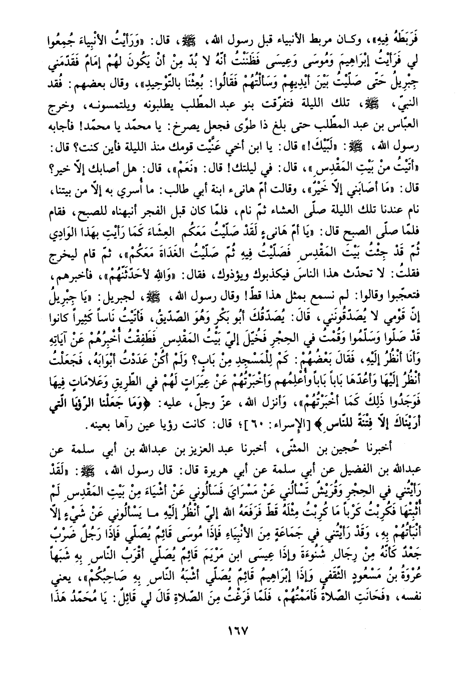 نَامَ عِنْدَنَا تِلْكَ اللَّيْلَةِ صَلَّى الْعِشَاءَ ثُمَّ نَامَ. فَلَمَّا كَانَ قَبْلَ الْفَجْرِ أَنْبَهْنَاهُ لِلصُّبُحِ. فَقَامَ فَلَمَّا صَلَّى الصُّبْحَ قَالَ: [يَا أُمَّ هَانِئٍ لَقَدْ صَلَّيْتُ مَعَكُمُ الْعِشَاءَ كَمَا رَأَيْتِ بِهَذَا الْوَادِي ثُمَّ قَدْ جِئْتُ بَيْتَ الْمَقْدِسِ فَصَلَّيْتُ فِيهِ ثُمَّ صَلَّيْتُ الْغَدَاةَ مَعَكُمْ. ثُمَّ قَامَ لِيَخْرُجَ فَقُلْتُ: لا تُحَدِّثْ هَذَا النَّاسَ فَيُكَذِّبُوكَ وَيُؤْذُوكَ. فَقَالَ: وَاللَّهِ لأُحَدِّثُنَّهُمْ. فَأَخْبَرَهُمْ.