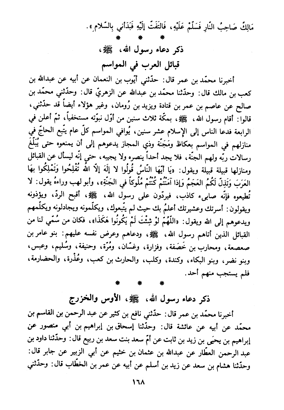 قَالُوا: أَقَامَ رَسُولُ اللَّهِ - صَلَّى اللَّهُ عَلَيْهِ وَسَلَّمَ - بِمَكَّةَ ثَلاثَ سِنِينَ مِنْ أَوَّلِ نُبُوَّتِهِ مُسْتَخْفِيًا. ثُمَّ أَعْلَنَ فِي الرَّابِعَةِ فَدَعَا النَّاسَ إِلَى الإِسْلامِ عَشْرَ سِنِينَ. يُوَافِي الْمَوَاسِمَ كُلَّ عَامٍ يَتَّبِعُ الْحَاجَّ فِي مَنَازِلِهِمْ فِي الْمَوَاسِمِ بِعُكَاظٍ وَمَجَنَّةَ وَذِي الْمَجَازِ يَدْعُوهُمْ إِلَى أَنْ يَمْنَعُوهُ حَتَّى يُبَلِّغَ رِسَالاتِ رَبِّهِ وَلَهُمُ الْجَنَّةُ. فَلا يَجِدُ أَحَدًا يَنْصُرُهُ وَلا يُجِيبُهُ. حَتَّى إِنَّهُ لَيَسْأَلُ عَنِ الْقَبَائِلِ وَمَنَازِلِهَا قَبِيلَةً قَبِيلَةً [وَيَقُولُ: يَا أَيُّهَا النَّاسُ قُولُوا لا إِلَهَ إِلا اللَّهُ تُفْلِحُوا وَتَمْلِكُوا بِهَا الْعَرَبَ وَتَذِلَّ لَكُمُ الْعَجَمُ وَإِذَا آمَنْتُمْ كُنْتُمْ مُلُوكًا فِي الْجَنَّةِ] . وَأَبُو لَهَبٍ وَرَاءَهُ يَقُولُ: لا تُطِيعُوهُ فَإِنَّهُ صَابِئٌ كَاذِبٌ. فَيَرُدُّونَ على رسول الله - صلى الله عليه وسلم - أَقْبَحَ الرَّدِّ. وَيُؤْذُونَهُ وَيَقُولُونَ: أُسْرَتُكَ وَعَشِيرَتُكَ أَعْلَمُ بِكَ حَيْثُ لَمْ يَتَّبِعُوكَ. وَيُكَلِّمُونَهُ وَيُجَادِلُونَهُ وَيُكَلِّمُهُمْ وَيَدْعُوهُمْ إِلَى اللَّهِ وَيَقُولُ: [اللَّهُمَّ لَوْ شِئْتَ لَمْ يَكُونُوا هَكَذَا] . فَكَانَ مَنْ سُمِّيَ لَنَا مِنَ الْقَبَائِلِ الَّذِينَ أَتَاهُمْ رَسُولُ اللَّهِ - صَلَّى اللَّهُ عَلَيْهِ وَسَلَّمَ - وَدَعَاهُمْ وَعَرَضَ نَفْسَهُ عَلَيْهِمْ: بَنُو عَامِرِ بْنِ صَعْصَعَةَ. وَمُحَارِبُ بْنُ خَصَفَةَ. وَفَزَارَةُ. وَغَسَّانُ. وَمُرَّةُ. وَحَنِيفَةُ. وَسُلَيْمٌ. وَعَبْسٌ.