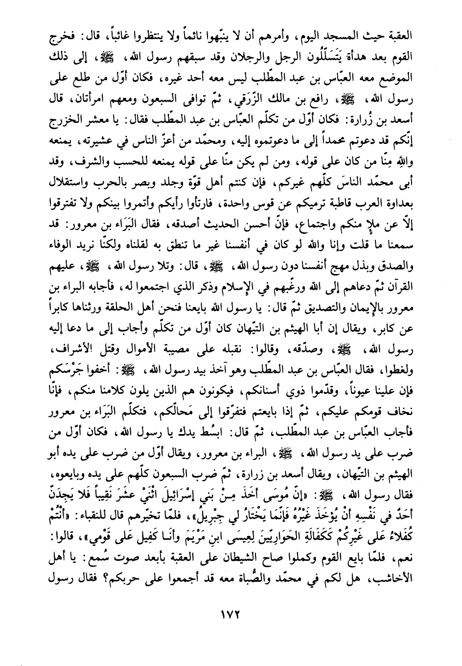 الْعَقَبَةِ حَيْثُ الْمَسْجِدُ الْيَوْمَ. وَأَمَرَهُمْ أَنْ لا يُنْبِهُوا نَائِمًا وَلا يَنْتَظِرُوا غَائِبًا. قَالَ: فَخَرَجَ الْقَوْمُ بَعْدَ هَدْأَةٍ يَتَسَلَّلُونَ الرَّجُلُ وَالرِّجْلانِ وَقَدْ سَبَقَهُمْ رَسُولُ اللَّهِ - صَلَّى اللَّهُ عَلَيْهِ وَسَلَّمَ - إِلَى ذَلِكَ الْمَوْضِعِ مَعَهُ الْعَبَّاسُ بْنُ عَبْدِ الْمُطَّلِبِ لَيْسَ مَعَهُ أَحَدٌ غَيْرَهُ. فَكَانَ أَوَّلَ مَنْ طَلَعَ عَلَى رَسُولِ اللَّهِ - صَلَّى اللَّهُ عَلَيْهِ وَسَلَّمَ - رَافِعُ بْنُ مَالِكٍ الزُّرَقِيُّ. ثُمَّ تَوَافَى السَّبْعُونَ وَمَعَهُمُ امْرَأَتَانِ. قَالَ أَسْعَدُ بْنُ زُرَارَةَ: فَكَانَ أَوَّلَ مَنْ تَكَلَّمَ الْعَبَّاسُ بْنُ عَبْدِ الْمُطَّلِبِ فَقَالَ: يَا مَعْشَرَ الْخَزْرَجِ إِنَّكُمْ قَدْ دَعَوْتُمْ مُحَمَّدًا إِلَى مَا دَعَوْتُمُوهُ إِلَيْهِ. وَمُحَمَّدٌ مِنْ أَعَزِّ النَّاسِ فِي عَشِيرَتِهِ. يَمْنَعُهُ وَاللَّهِ مِنَّا مَنْ كَانَ عَلَى قَوْلِهِ. وَمَنْ لَمْ يَكُنْ مِنَّا عَلَى قَوْلِهِ يَمْنَعُهُ لِلْحَسَبِ وَالشَّرَفِ. وَقَدْ أَبَى مُحَمَّدٌ النَّاسَ كُلَّهُمْ غَيْرَكُمْ. فَإِنْ كُنْتُمْ أَهْلَ قُوَّةٍ وَجَلَدٍ وَبَصَرٍ بِالْحَرْبِ وَاسْتِقْلالٍ بِعَدَاوَةِ الْعَرَبِ قَاطِبَةً تَرْمِيكُمْ عَنْ قَوْسٍ واحدة. فارتأوا رأيكم وأتمروا بَيْنَكُمْ وَلا تَفْتَرِقُوا إِلا عَنْ مَلإٍ مِنْكُمْ وَاجْتِمَاعٍ. فَإِنَّ أَحْسَنَ الْحَدِيثِ أَصْدَقُهُ. فَقَالَ الْبَرَاءُ بْنُ مَعْرُورٍ: قَدْ سَمِعْنَا مَا قُلْتَ وَإِنَّا وَاللَّهِ لَوْ كَانَ فِي أَنْفُسِنَا غَيْرُ مَا تَنْطِقُ بِهِ لَقُلْنَاهُ وَلَكِنَّا نُرِيدُ الْوَفَاءَ وَالصِّدْقَ وَبَذْلَ مُهَجِ أَنْفُسِنَا دُونَ رَسُولِ اللَّهِ - صَلَّى اللَّهُ عَلَيْهِ وَسَلَّمَ - قَالَ: وَتَلا رَسُولُ اللَّهِ - صَلَّى اللَّهُ عَلَيْهِ وَسَلَّمَ - عَلَيْهِمُ الْقُرْآنَ ثُمَّ دَعَاهُمْ إِلَى اللَّهِ وَرَغَّبَهُمْ فِي الإِسْلامِ وَذَكَرَ الَّذِي اجْتَمَعُوا لَهُ. فَأَجَابَهُ الْبَرَاءُ بْنُ مَعْرُورٍ بِالإِيمَانِ وَالتَّصْدِيقِ ثُمَّ قَالَ: يَا رَسُولَ اللَّهِ بَايِعْنَا فَنَحْنُ أَهْلُ الْحَلْقَةِ وَرِثْنَاهَا كَابِرًا عَنْ كَابِرٍ. وَيُقَالُ إِنَّ أَبَا الْهَيْثَمِ بْنَ التَّيِّهَانِ كَانَ أَوَّلَ مَنْ تَكَلَّمَ وَأَجَابَ إِلَى مَا دَعَا إِلَيْهِ رَسُولُ اللَّهِ - صَلَّى اللَّهُ عَلَيْهِ وَسَلَّمَ - وَصَدَّقَهُ. وَقَالُوا: نَقْبَلُهُ عَلَى مُصِيبَةِ الأَمْوَالِ وَقَتْلِ الأَشْرَافِ.