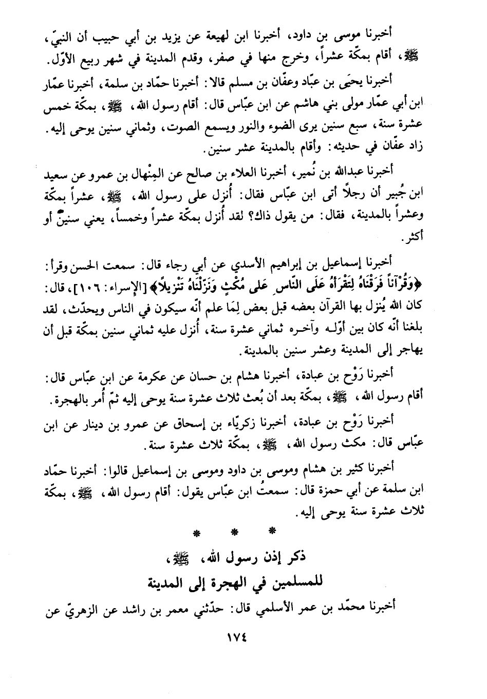 أَقَامَ رَسُولَ اللَّهِ - صَلَّى اللَّهُ عَلَيْهِ وَسَلَّمَ - بِمَكَّةَ بَعْدَ أَنْ بُعِثَ ثَلاثَ عَشْرَةَ سَنَةً يُوحَى إِلَيْهِ ثُمَّ أُمِرَ بِالْهِجْرَةِ.
