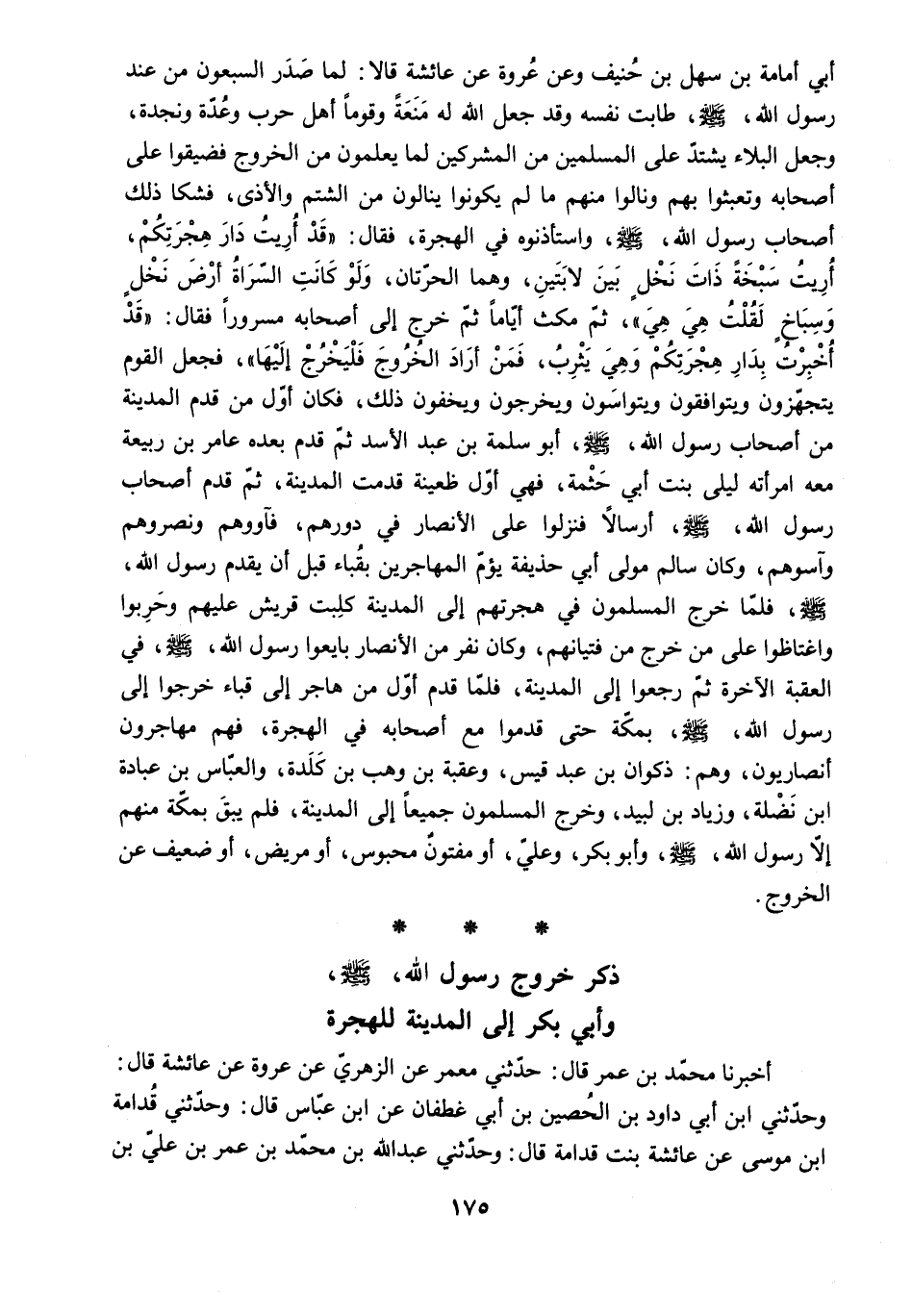 أُرِيتُ سَبْخَةً ذَاتَ نَخْلٍ بَيْنَ لابَتَيْنِ. وَهُمَا الْحَرَّتَانِ. وَلَوْ كَانَتِ السُّرَاةُ أَرْضَ نَخْلٍ وَسِبَاخٍ لَقُلْتُ هِيَ هِيَ. ثُمَّ مَكَثَ أَيَّامًا ثُمَّ خَرَجَ إِلَى أَصْحَابِهِ مَسْرُورًا فَقَالَ: قَدْ أُخْبِرْتُ بِدَارِ هِجْرَتِكُمْ وَهِيَ يَثْرِبُ. فَمَنْ أَرَادَ الْخُرُوجَ فَلْيَخْرُجْ إِلَيْهَا] . فَجَعَلَ الْقَوْمُ يَتَجَهَّزُونَ وَيَتَوَافَقُونَ وَيَتَوَاسُونَ وَيَخْرُجُونَ وَيُخْفُونَ ذَلِكَ. فَكَانَ أَوَّلَ مَنْ قَدِمَ الْمَدِينَةَ مِنْ أَصْحَابِ رَسُولِ اللَّهِ - صَلَّى اللَّهُ عَلَيْهِ وَسَلَّمَ - أَبُو سَلَمَةَ بْنُ عَبْدِ الأَسَدِ ثُمَّ قَدِمَ بَعْدَهُ عَامِرُ بْنُ رَبِيعَةَ مَعَهُ امْرَأَتُهُ لَيْلَى بِنْتُ أَبِي حَثْمَةَ. فَهِيَ أَوَّلُ ظَعِينَةٍ قَدِمَتِ الْمَدِينَةَ. ثُمَّ قَدِمَ أَصْحَابُ رَسُولِ اللَّهِ - صَلَّى اللَّهُ عَلَيْهِ وَسَلَّمَ - أَرْسَالا فَنَزَلُوا عَلَى الأَنْصَارِ فِي دُورِهِمْ. فَآوَوْهُمْ وَنَصَرُوهُمْ وَآسُوهُمْ. وَكَانَ سَالِمٌ مَوْلَى أَبِي حُذَيْفَةَ يَؤُمُّ الْمُهَاجِرِينَ بِقُبَاءَ قبل أن يقدم رسول الله.