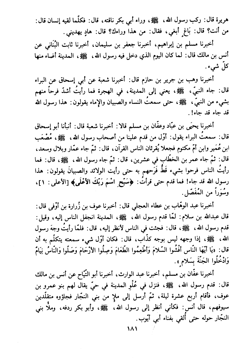 أَخْبَرَنَا وَهْبُ بْنُ جَرِيرِ بْنِ حَازِمٍ قَالَ: أَخْبَرَنَا شُعْبَةُ عَنْ أَبِي إِسْحَاقَ عَنِ الْبَرَاءِ قَالَ: جَاءَ النَّبِيُّ - صَلَّى اللَّهُ عَلَيْهِ وَسَلَّمَ - يَعْنِي إِلَى الْمَدِينَةِ. فِي الْهِجْرَةِ فَمَا رَأَيْتُ أَشَدَّ فَرَحًا مِنْهُمْ بِشَيْءٍ مِنَ النَّبِيِّ - صَلَّى اللَّهُ عَلَيْهِ وَسَلَّمَ - حَتَّى سَمِعْتُ النِّسَاءَ وَالصِّبْيَانَ وَالإِمَاءَ يَقُولُونَ: هَذَا رَسُولُ اللَّهِ قَدْ جَاءَ قَدْ جَاءَ!.