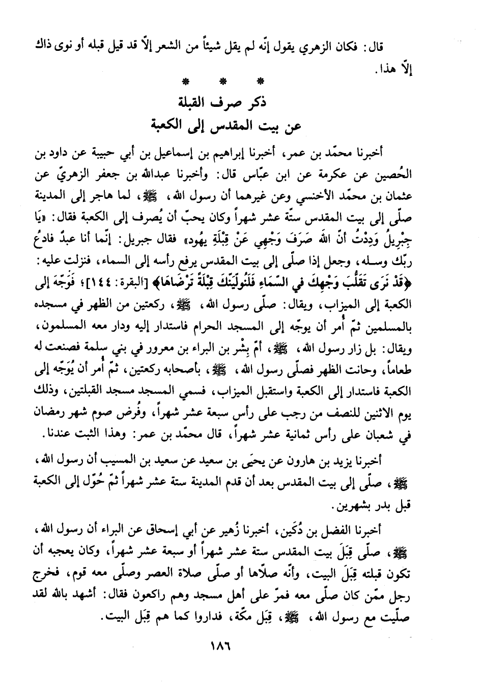 «قَدْ نَرى تَقَلُّبَ وَجْهِكَ فِي السَّماءِ فَلَنُوَلِّيَنَّكَ قِبْلَةً تَرْضاها» البقرة: 144. فَوُجِّهَ إِلَى الْكَعْبَةِ إِلَى الْمِيزَابِ. وَيُقَالُ: صَلَّى رَسُولُ اللَّهِ - صَلَّى اللَّهُ عَلَيْهِ وَسَلَّمَ - رَكْعَتَيْنِ مِنَ الظُّهْرِ فِي مَسْجِدِهِ بِالْمُسْلِمِينَ ثُمَّ أُمِرَ أَنْ يُوَجِّهَ إِلَى الْمَسْجِدِ الْحَرَامِ فَاسْتَدَارَ إِلَيْهِ وَدَارَ مَعَهُ الْمُسْلِمُونَ.