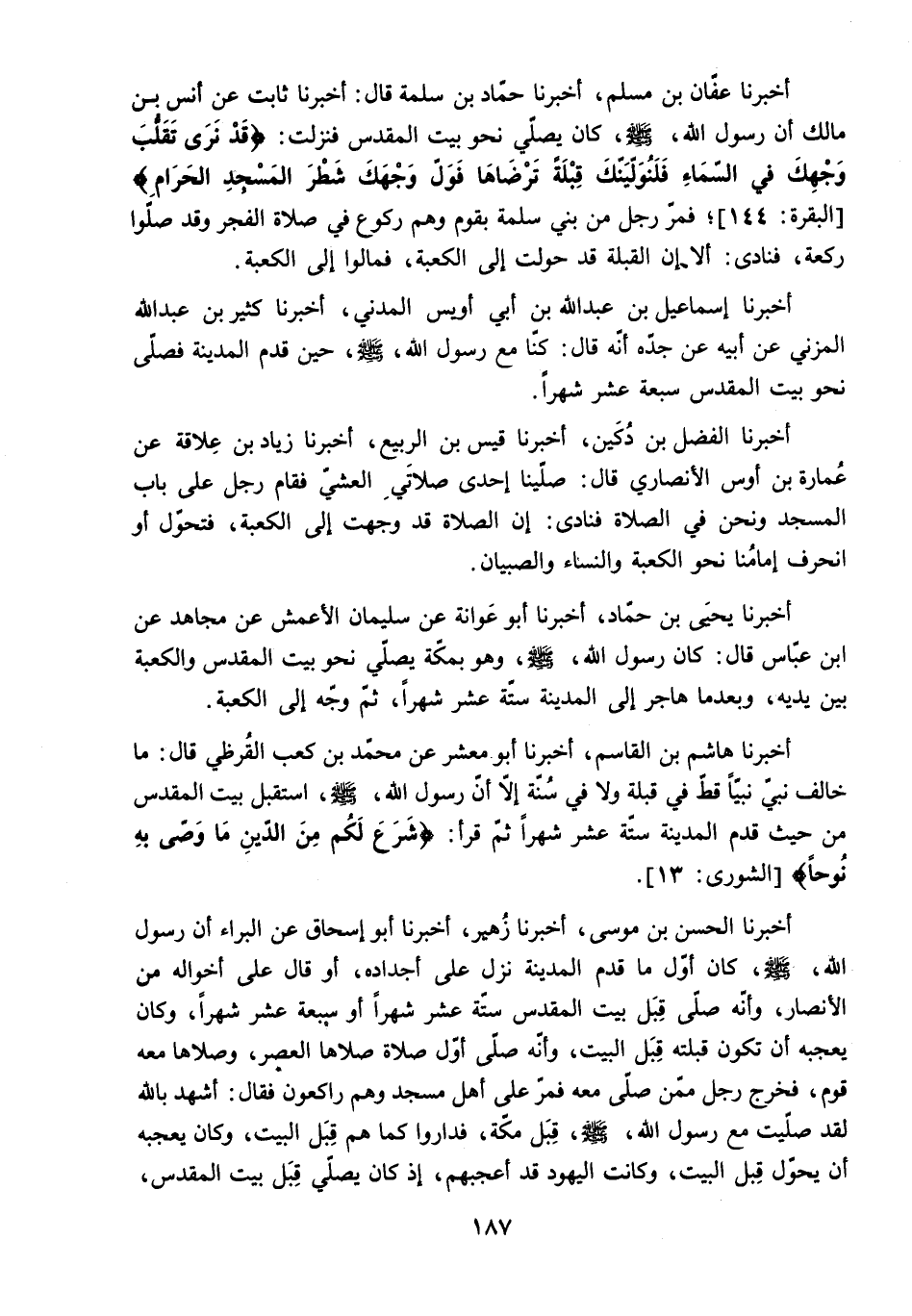 أَخْبَرَنَا عَفَّانُ بْنُ مُسْلِمٍ. أَخْبَرَنَا حَمَّادُ بْنُ سَلَمَةَ قَالَ: أَخْبَرَنَا ثَابِتٌ عَنْ أَنَسِ بْنِ مَالِكٍ أَنَّ رَسُولَ اللَّهِ - صَلَّى اللَّهُ عَلَيْهِ وَسَلَّمَ - كَانَ يُصَلِّي نَحْوَ بَيْتِ الْمَقْدِسِ فَنَزَلَتْ: «قَدْ نَرى تَقَلُّبَ وَجْهِكَ فِي السَّماءِ فَلَنُوَلِّيَنَّكَ قِبْلَةً تَرْضاها فَوَلِّ وَجْهَكَ شَطْرَ الْمَسْجِدِ الْحَرامِ» البقرة: 144. فَمَرَّ رَجُلٌ مِنْ بَنِي سَلَمَةَ بِقُومٍ وَهُمْ رُكُوعٌ فِي صَلاةِ الْفَجْرِ وَقَدْ صَلُّوا رَكْعَةً. فَنَادَى: أَلا إِنَّ الْقِبْلَةَ قَدْ حُوِّلَتْ إِلَى الْكَعْبَةِ. فَمَالُوا إِلَى الْكَعْبَةِ.