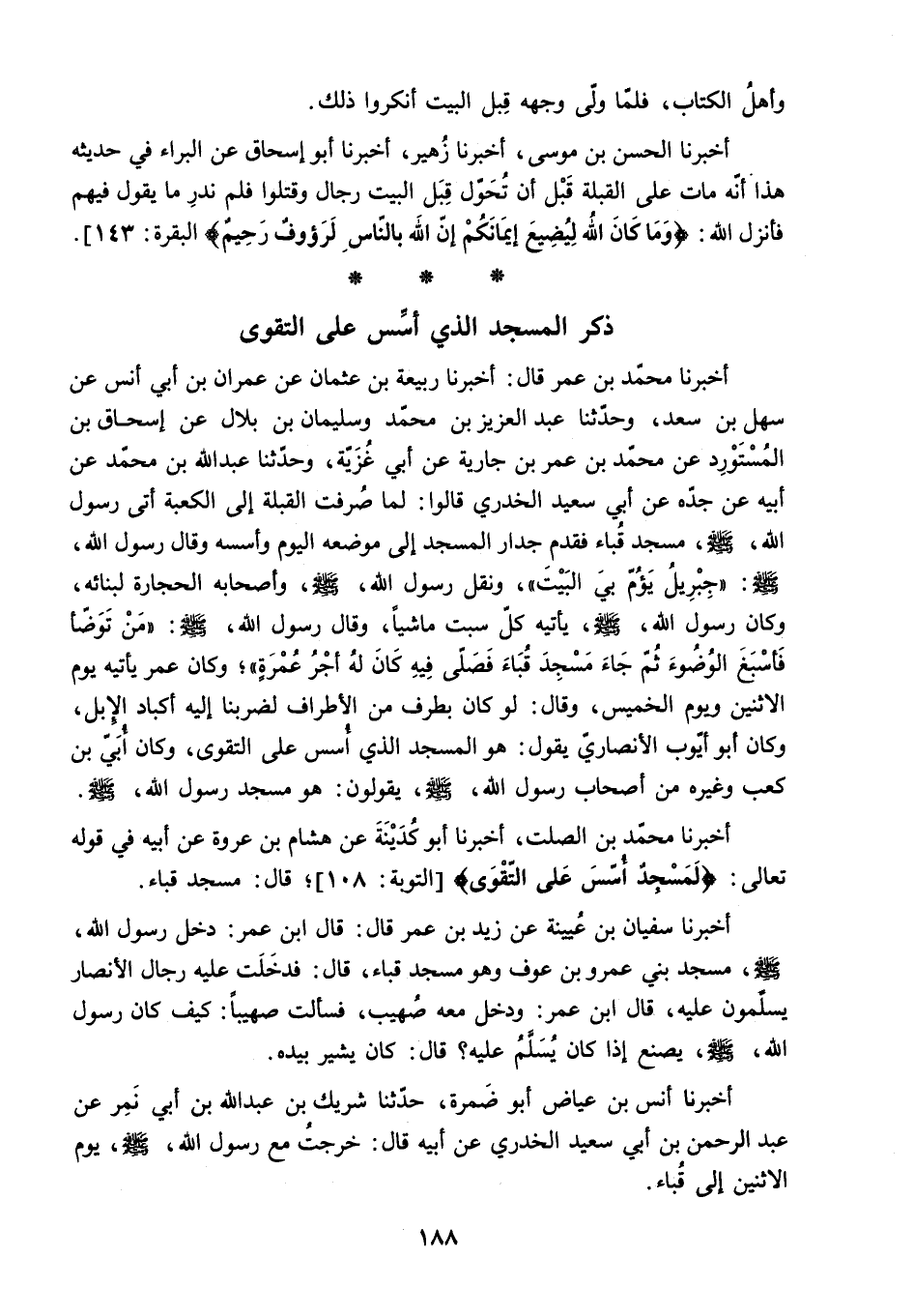 وَكَانَ أَبُو أَيُّوبَ الأَنْصَارِيُّ يَقُولُ: هُوَ الْمَسْجِدُ الَّذِي أُسِّسَ عَلَى التَّقْوى. وَكَانَ أُبَيُّ بْنُ كَعْبٍ وَغَيْرُهُ مِنْ أَصْحَابِ رَسُولِ اللَّهِ - صَلَّى اللَّهُ عَلَيْهِ وَسَلَّمَ - يَقُولُونَ: هُوَ مَسْجِدُ رَسُولِ اللَّهِ - صَلَّى اللَّهُ عَلَيْهِ وَسَلَّمَ - أَخْبَرَنَا مُحَمَّدُ بْنُ الصَّلْتِ. أَخْبَرَنَا أَبُو كُدَيْنَةَ عَنْ هِشَامِ بْنِ عُرْوَةَ عَنْ أَبِيهِ فِي قَوْلِهِ تَعَالَى: «لَمَسْجِدٌ أُسِّسَ عَلَى التَّقْوى» التوبة: 108. قَالَ: مَسْجِدُ قُبَاءَ.
