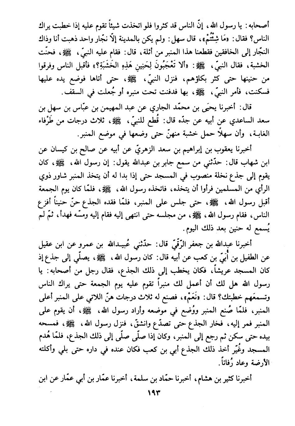 أَصْحَابُهُ: يَا رَسُولَ اللَّهِ. إِنَّ النَّاسَ قَدْ كَثُرُوا فَلَوِ اتَّخَذْتَ شَيْئًا تَقُومُ عَلَيْهِ إِذَا خَطَبْتَ يَرَاكَ النَّاسُ؟ فَقَالَ: مَا شِئْتُمْ. قَالَ سَهْلٌ: وَلَمْ يَكُنْ بِالْمَدِينَةِ إِلا نَجَّارٌ وَاحِدٌ ذهبت أَنَا وَذَاكَ النَّجَّارُ إِلَى الْخَافِقَيْنِ فَقَطَعْنَا هَذَا الْمِنْبَرَ مِنْ أَثْلَةٍ. قَالَ: [فَقَامَ عَلَيْهِ النَّبِيُّ - صَلَّى اللَّهُ عَلَيْهِ وَسَلَّمَ - فَحَنَّتِ الْخَشَبَةُ. فَقَالَ النبي. ص: أَلا تَعْجَبُونَ لِحَنِينِ هَذِهِ الْخَشَبَةِ] ؟ فَأَقْبَلَ النَّاسُ وَفَرِقُوا مِنْ حَنِينِهَا حَتَّى كَثُرَ بُكَاؤُهُمْ. فَنَزَلَ النَّبِيُّ - صَلَّى اللَّهُ عَلَيْهِ وَسَلَّمَ - حَتَّى أَتَاهَا فَوَضَعَ يَدَهُ عَلَيْهَا فَسَكَنَتْ. فَأَمَرَ النَّبِيُّ - صَلَّى اللَّهُ عَلَيْهِ وَسَلَّمَ - بِهَا فَدُفِنَتْ تَحْتَ مِنْبَرِهِ أَوْ جُعِلَتْ فِي السَّقْفِ.