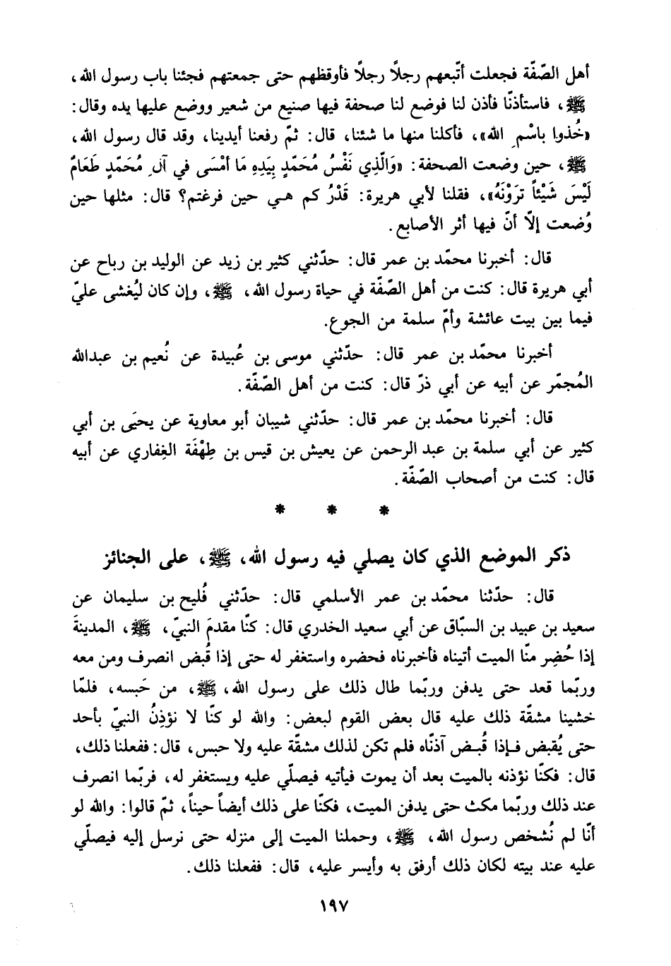 ص. حِينَ وُضِعَتِ الصَّحْفَةُ: وَالَّذِي نَفْسُ مُحَمَّدٍ بِيَدِهِ مَا أَمْسَى فِي آلِ مُحَمَّدٍ طَعَامٌ لَيْسَ شَيْئًا تَرَوْنَهُ. فَقُلْنَا لأَبِي هُرَيْرَةَ: قَدْرُ كَمْ حِينَ فَرَغْتُمْ؟ قَالَ: مِثْلُهَا حِينَ وُضِعَتْ إِلا أَنَّ فِيهَا أَثَرَ الأَصَابِعِ] .