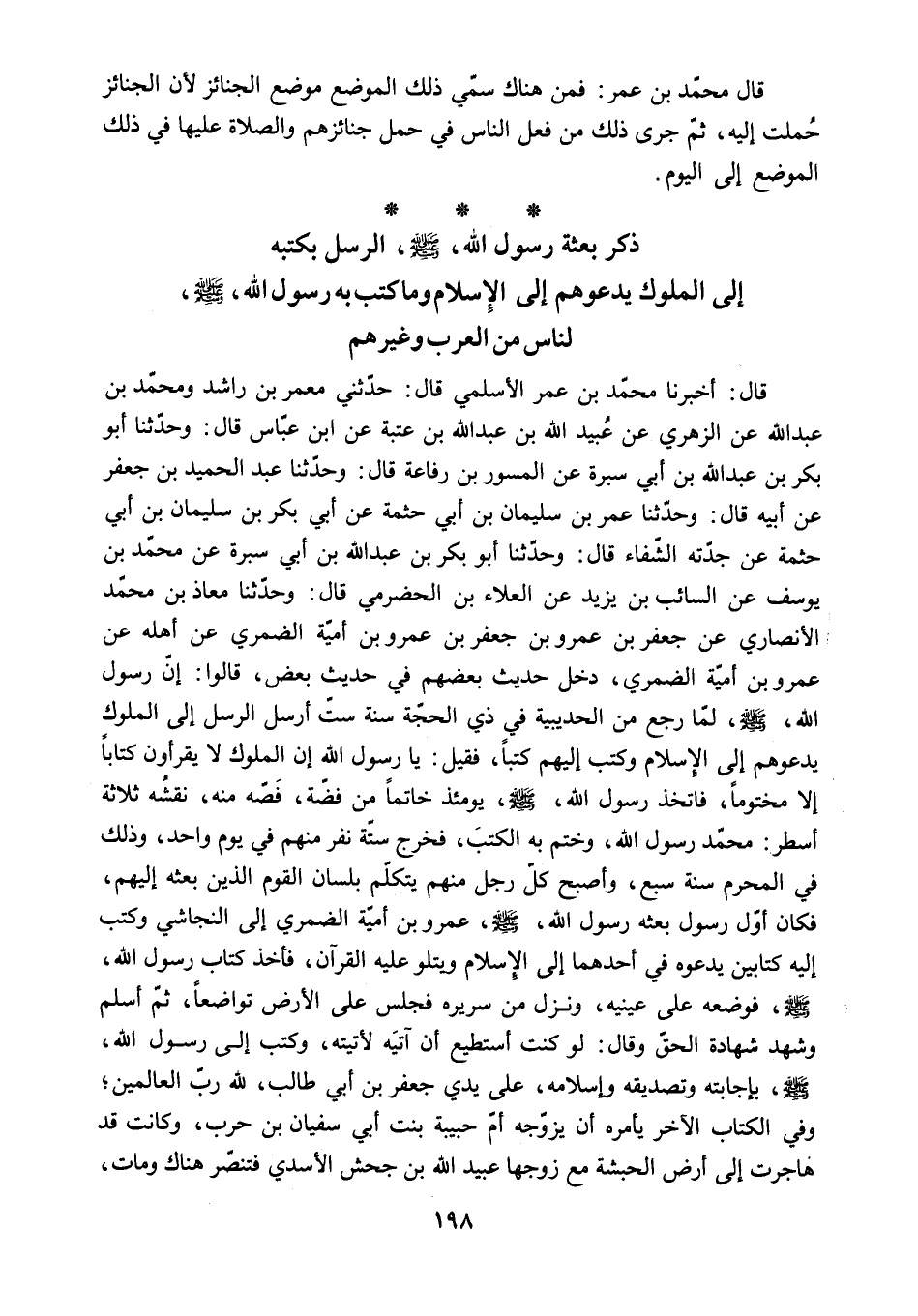 قَالَ: أَخْبَرَنَا مُحَمَّدُ بْنُ عُمَرَ الأَسْلَمِيُّ قَالَ: حَدَّثَنِي مَعْمَرُ بْنُ رَاشِدٍ وَمُحَمَّدُ بْنُ عَبْدِ اللَّهِ عَنِ الزُّهْرِيِّ عَنْ عُبَيْدِ اللَّهِ بْنِ عَبْدِ اللَّهِ بْنِ عُتْبَةَ عَنِ ابْنِ عَبَّاسٍ قَالَ: وَحَدَّثَنَا أَبُو بَكْرِ بْنُ عَبْدِ اللَّهِ بْنِ أَبِي سبرة عن الْمِسْوَرِ بْنِ رِفَاعَةَ قَالَ: وَحَدَّثَنَا عَبْدُ الْحَمِيدِ بْنُ جَعْفَرٍ عَنْ أَبِيهِ قَالَ: وَحَدَّثَنَا عُمَرُ بْنُ سُلَيْمَانَ بْنِ أَبِي حَثْمَةَ عَنْ أَبِي بَكْرِ بْنِ سُلَيْمَانَ بْنِ أَبِي حَثْمَةَ عَنْ جَدَّتِهِ الشِّفَاءِ قَالَ: وَحَدَّثَنَا أَبُو بَكْرِ بْنُ عَبْدِ اللَّهِ بْنِ أَبِي سَبْرَةَ عَنْ مُحَمَّدِ بْنِ يُوسُفَ عَنِ السَّائِبِ بْنِ يَزِيدَ عَنِ الْعَلاءِ بْنِ الْحَضْرَمِيِّ قَالَ: وَحَدَّثَنَا مُعَاذُ بْنُ مُحَمَّدٍ الأَنْصَارِيُّ عَنْ جَعْفَرِ بْنِ عَمْرِو بْنِ جَعْفَرِ بْنِ عَمْرِو بْنِ أُمَيَّةَ الضَّمْرِيِّ عَنْ أَهْلِهِ عَنْ عَمْرِو بْنِ أُمَيَّةَ الضَّمْرِيِّ دَخَلَ حَدِيثُ بَعْضِهِمْ فِي حَدِيثِ بَعْضٍ. قَالُوا: إِنَّ رسول الله - صلى الله عليه وسلم - لما رَجَعَ مِنَ الْحُدَيْبِيَةِ فِي ذِي الْحِجَّةِ سَنَةَ سِتٍّ أَرْسَلَ الرُّسُلَ إِلَى الْمُلُوكِ يَدْعُوهُمْ إِلَى الإِسْلامِ وَكَتَبَ إِلَيْهِمْ كُتُبًا. فَقِيلَ: يَا رَسُولَ الله إن الملوك لا يقرأون كِتَابًا إِلا مَخْتُومًا. فَاتَّخَذَ رَسُولُ اللَّهِ - صَلَّى اللَّهُ عَلَيْهِ وَسَلَّمَ - يَوْمَئِذٍ خَاتَمًا مِنْ فِضَّةٍ. فَصُّهُ مِنْهُ. نَقْشُهُ ثَلاثَةَ أَسْطُرٍ: مُحَمَّدٌ رَسُولُ اللَّهِ. وَخَتَمَ بِهِ الْكُتُبَ. فَخَرَجَ سِتَّةُ نَفَرٍ مِنْهُمْ فِي يَوْمٍ وَاحِدٍ. وَذَلِكَ فِي الْمُحَرَّمِ سَنَةَ سَبْعٍ. وَأَصْبَحَ كُلُّ رَجُلٍ مِنْهُمْ يَتَكَلَّمُ بِلِسَانِ الْقَوْمِ الَّذِينَ بَعَثَهُ إِلَيْهِمْ.