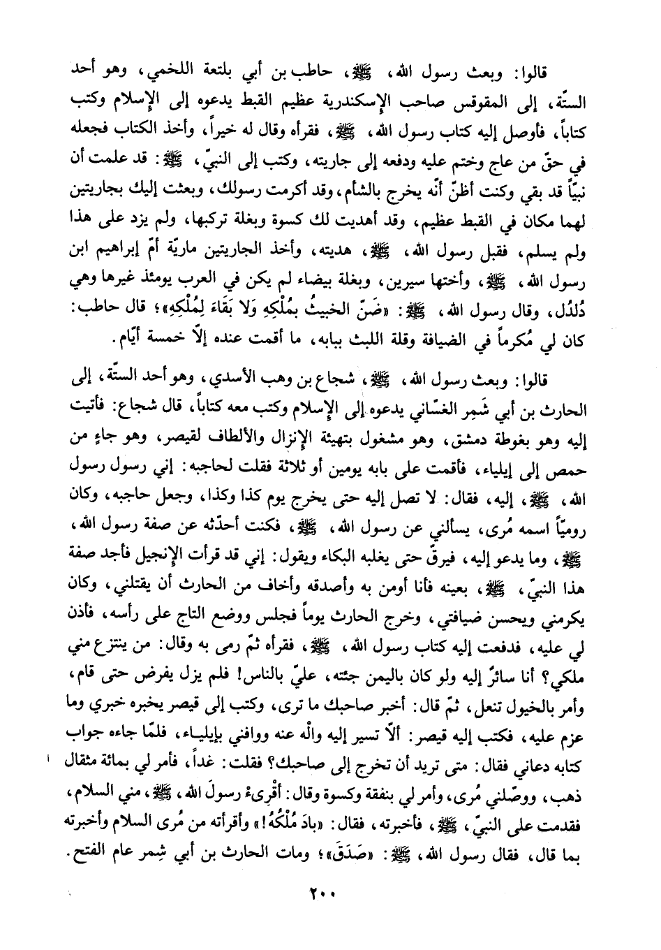 قَالُوا: وَبَعَثَ رَسُولُ اللَّهِ - صَلَّى اللَّهُ عَلَيْهِ وَسَلَّمَ - حَاطِبَ بْنَ أَبِي بَلْتَعَةَ اللَّخْمِيَّ. وَهُوَ أَحَدُ السِّتَّةِ. إِلَى الْمُقَوْقَسِ صَاحِبِ الإِسْكَنْدَرِيَّةِ عَظِيمِ القبط يدعوه إلى الإسلام وكتب كِتَابًا. فَأَوْصَلَ إِلَيْهِ كِتَابَ رَسُولِ اللَّهِ - صَلَّى اللَّهُ عَلَيْهِ وَسَلَّمَ - فَقَرَأَهُ وَقَالَ لَهُ خَيْرًا. وَأَخَذَ الْكِتَابَ فَجَعَلَهُ فِي حُقٍّ مِنْ عَاجٍ وَخَتَمَ عَلَيْهِ وَدَفَعَهُ إِلَى جَارِيَتِهِ. وَكَتَبَ إِلَى النبي. ص: قَدْ عَلِمْتُ أَنَّ نَبِيًّا قَدْ بَقِيَ وَكُنْتُ أَظُنُّ أَنَّهُ يَخْرُجُ بِالشَّامِ. وَقَدْ أَكْرَمْتُ رَسُولَكَ. وَبَعَثْتُ إِلَيْكَ بِجَارِيَتَيْنِ لَهُمَا مَكَانٌ فِي الْقِبْطِ عَظِيمٌ. وَقَدْ أَهْدَيْتُ لَكَ كِسْوَةً وَبَغْلَةً تَرْكَبُهَا. وَلَمْ يَزِدْ عَلَى هَذَا وَلَمْ يُسَلِّمْ. فَقَبِلَ رَسُولُ اللَّهِ - صَلَّى اللَّهُ عَلَيْهِ وَسَلَّمَ - هَدِيَّتَهُ. وَأَخَذَ الْجَارِيَتَيْنِ مَارِيَةَ أُمَّ إِبْرَاهِيمَ ابْنِ رَسُولِ اللَّهِ - صَلَّى اللَّهُ عَلَيْهِ وَسَلَّمَ - وَأُخْتَهَا سِيرِينَ وَبَغْلَةً بَيْضَاءَ لَمْ يَكُنْ فِي الْعَرَبِ يَوْمَئِذٍ غيرها وهي دلدل. و [قال رسول الله. ص: ضَنَّ الْخَبِيثُ بِمُلْكِهِ وَلا بَقَاءَ لِمُلْكِهِ. قَالَ حَاطِبٌ] :