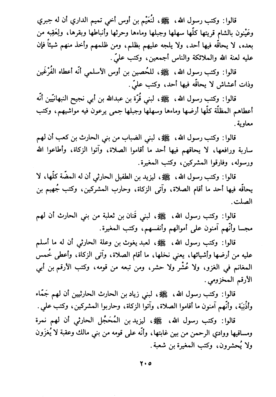 قَالُوا: وَكَتَبَ رَسُولُ اللَّهِ - صَلَّى اللَّهُ عَلَيْهِ وَسَلَّمَ - لِيَزِيدَ بْنِ الطُّفَيْلِ الْحَارِثِيِّ أَنَّ لَهُ الْمَضَّةَ كُلَّهَا. لا يُحَاقُّهُ فِيهَا أَحَدٌ مَا أَقَامَ الصَّلاةَ. وَآتَى الزَّكَاةَ. وَحَارَبَ الْمُشْرِكِينَ. وَكَتَبَ جُهَيْمُ بْنُ الصَّلْتِ.
