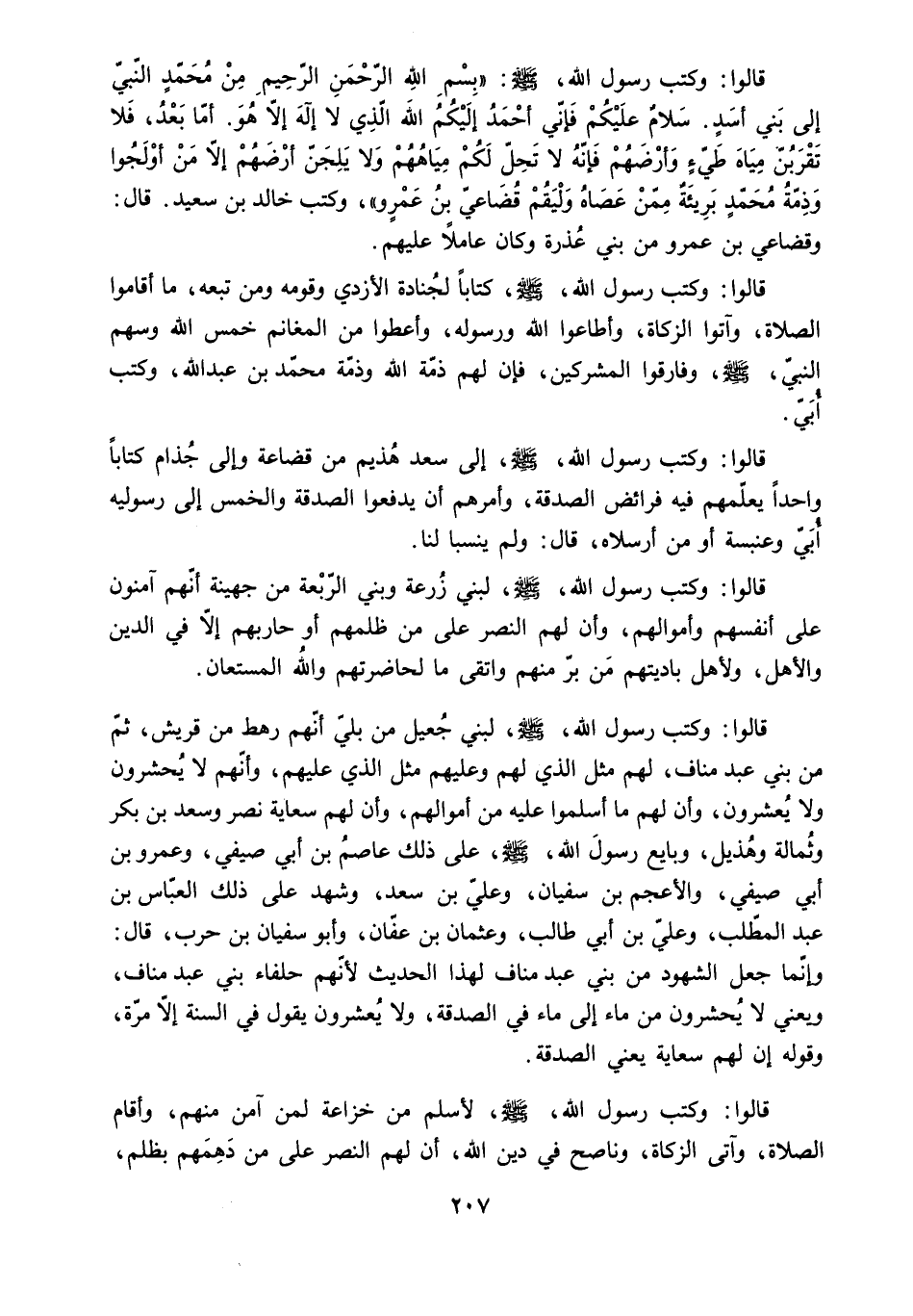 قالوا: وكتب رسول الله. ص: بِسْمِ اللَّهِ الرَّحْمَنِ الرَّحِيمِ مِنْ مُحَمَّدٍ النَّبِيِّ إِلَى بَنِي أَسَدٍ. سَلامٌ عَلَيْكُمْ فَإِنِّي أَحْمَدُ إِلَيْكُمُ اللَّهَ الَّذِي لا إِلَهَ إِلا هُوَ. أَمَّا بَعْدُ. فَلا تَقْرَبُنَّ مِيَاهَ طَيِّئٍ وَأَرْضَهُمْ فَإِنَّهُ لا تَحِلُّ لَكُمْ مِيَاهُهُمْ وَلا يَلِجَنَّ أَرْضَهُمْ إِلا مَنْ أَوْلَجُوا وَذِمَّةُ مُحَمَّدٍ بَرِيئَةٌ مِمَّنْ عَصَاهُ وَلْيَقُمْ قُضَاعِيُّ بْنُ عَمْرٍو. وَكَتَبَ خَالِدُ بْنُ سَعِيدٍ. قَالَ: