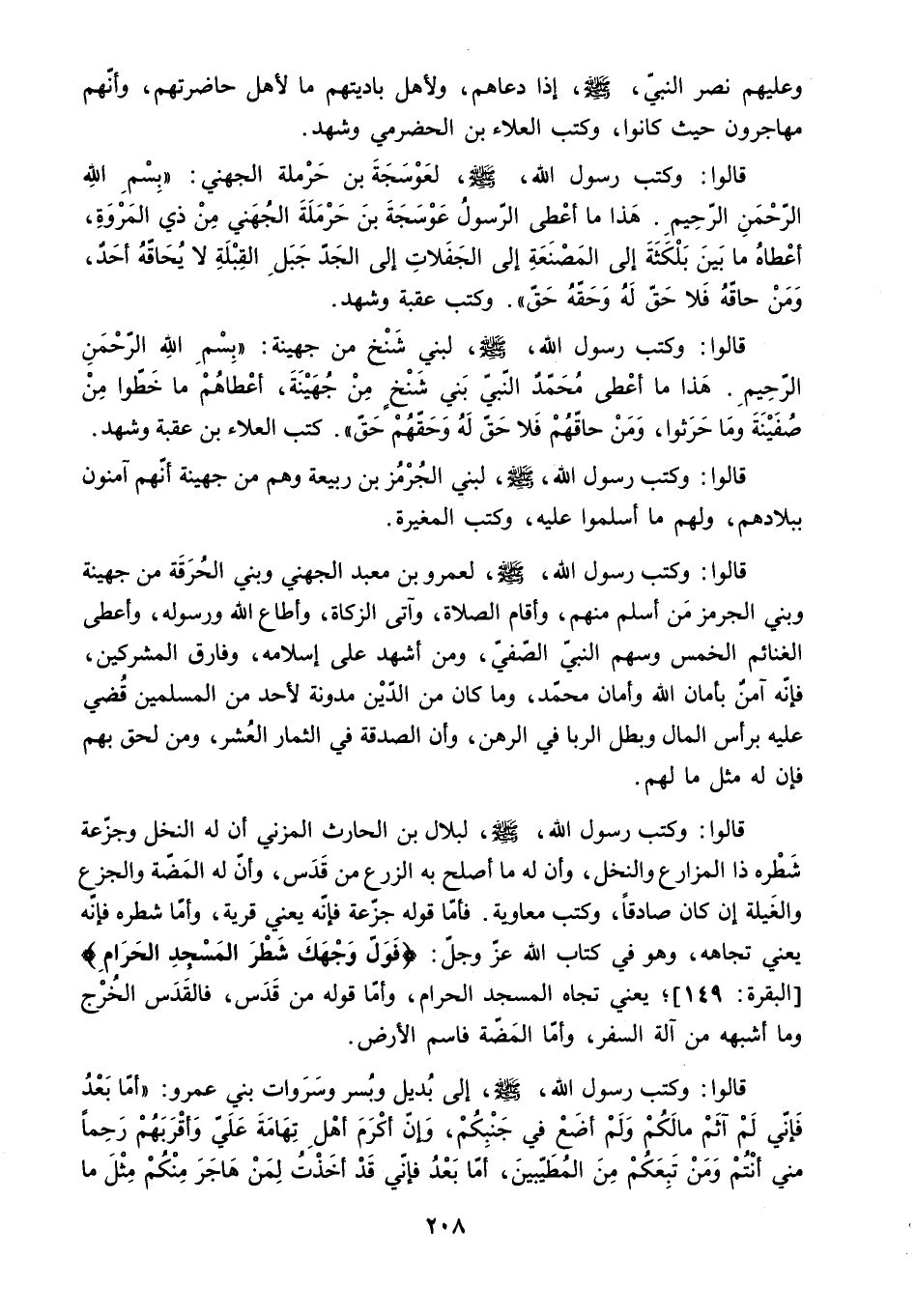 فَإِنَّهُ آمِنٌ بِأَمَانِ اللَّهِ وَأَمَانِ مُحَمَّدٍ. وَمَا كَانَ مِنَ الدَّيْنِ مَدُونَةٌ لأَحَدٍ مِنَ الْمُسْلِمِينَ قُضِيَ عَلَيْهِ بِرَأْسِ الْمَالِ وَبَطَلَ الرِّبَا فِي الرَّهْنِ. وَأَنَّ الصَّدَقَةَ فِي الثِّمَارِ الْعُشْرُ. وَمَنْ لَحِقَ بِهِمْ فَإِنَّ لَهُ مِثْلَ مَا لَهُمْ. قَالُوا: وَكَتَبَ رَسُولُ اللَّهِ - صَلَّى اللَّهُ عَلَيْهِ وَسَلَّمَ - لِبِلالِ بْنِ الْحَارِثِ الْمُزَنِيِّ أَنَّ لَهُ النَّخْلَ وَجَزَعَةَ شَطْرِهِ ذَا الْمَزَارِعِ وَالنَّخْلِ. وَأَنَّ لَهُ مَا أَصْلَحَ بِهِ الزَّرْعَ مِنْ قَدَسٍ. وَأَنَّ لَهُ الْمَضَّةَ وَالْجَزَعَ وَالْغِيلَةَ إِنْ كَانَ صَادِقًا. وَكَتَبَ مُعَاوِيَةُ. فَأَمَّا قَوْلُهُ جَزْعَةٌ فَإِنَّهُ يَعْنِي قَرْيَةً. وَأَمَّا شَطْرُهُ فَإِنَّهُ يَعْنِي تُجَاهَهُ. وَهُوَ فِي كِتَابِ اللَّهِ عَزَّ وَجَلَّ: «فَوَلِّ وَجْهَكَ شَطْرَ الْمَسْجِدِ الْحَرامِ» البقرة: 149. يَعْنِي تُجَاهَ الْمَسْجِدِ الْحَرَامِ. وَأَمَّا قَوْلُهُ مِنْ قَدَسٍ. فَالْقَدَسُ الْخُرْجُ وَمَا أَشْبَهَهُ مِنْ آلَةِ السَّفَرِ. وَأَمَّا الْمَضَّةُ فَاسْمُ الأَرْضِ.