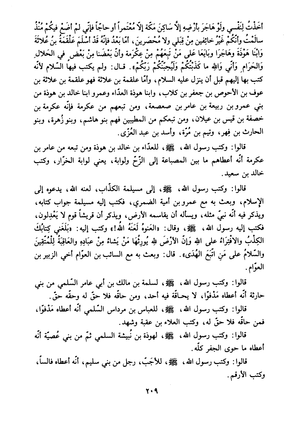 أَخَذْتُ لِنَفْسِي وَلَوْ هَاجَرَ بِأَرْضِهِ إِلا سَاكِنَ مَكَّةَ إِلا مُعْتَمِرًا أَوْ حَاجًّا فَإِنِّي لَمْ أَضَعْ فِيكُمْ مُنْذُ سَالَمْتُ وَأَنَّكُمْ غَيْرُ خَائِفِينَ مِنْ قِبَلِي وَلا مُحْصَرِينَ. أَمَّا بَعْدُ فَإِنَّهُ قَدْ أَسْلَمَ عَلْقَمَةُ بْنُ عُلاثَةَ وَابْنَا هَوْذَةَ وَهَاجَرَا وَبَايَعَا عَلَى مَنْ تَبِعَهُمْ مِنْ عِكْرِمَةَ وَأَنَّ بَعْضَنَا مِنْ بَعْضٍ فِي الْحَلالِ وَالْحَرَامِ وَإِنِّي وَاللَّهِ مَا كَذَبْتُكُمْ وَلَيُحِبَّنَّكُمْ رَبُّكُمْ. قَالَ: وَلَمْ يَكْتُبْ فِيهَا السَّلامَ لأَنَّهُ كَتَبَ بِهَا إليهم قبل أن ينزل ع. وَأَمَّا عَلْقَمَةُ بْنُ عُلاثَةَ فَهُوَ عَلْقَمَةُ بْنُ علاثة بن عوف بن الأحوص بن جعفر بْنِ كِلابٍ. وَابْنَا هَوْذَةَ الْعَدَّاءُ وَعَمْرٌو ابْنَا خَالِدِ بْنِ هَوْذَةَ مِنْ بَنِي عَمْرِو بْنِ رَبِيعَةَ بْنِ عَامِرِ بْنِ صَعْصَعَةَ. وَمَنْ تَبِعَهُمْ مِنْ عِكْرِمَةَ فَإِنَّهُ عِكْرِمَةُ بْنُ خَصَفَةَ بْنَ قَيْسِ بْنِ عَيْلانَ. وَمَنْ تَبِعَكُمْ مِنَ الْمُطَيَّبِينَ فَهُمْ بَنُو هَاشِمٍ. وَبَنُو زُهْرَةَ. وَبَنُو الْحَارِثِ بْنِ فِهْرِ. وَتَيْمُ بْنُ مُرَّةَ. وَأَسَدُ بْنُ عَبْدِ الْعُزَّى.