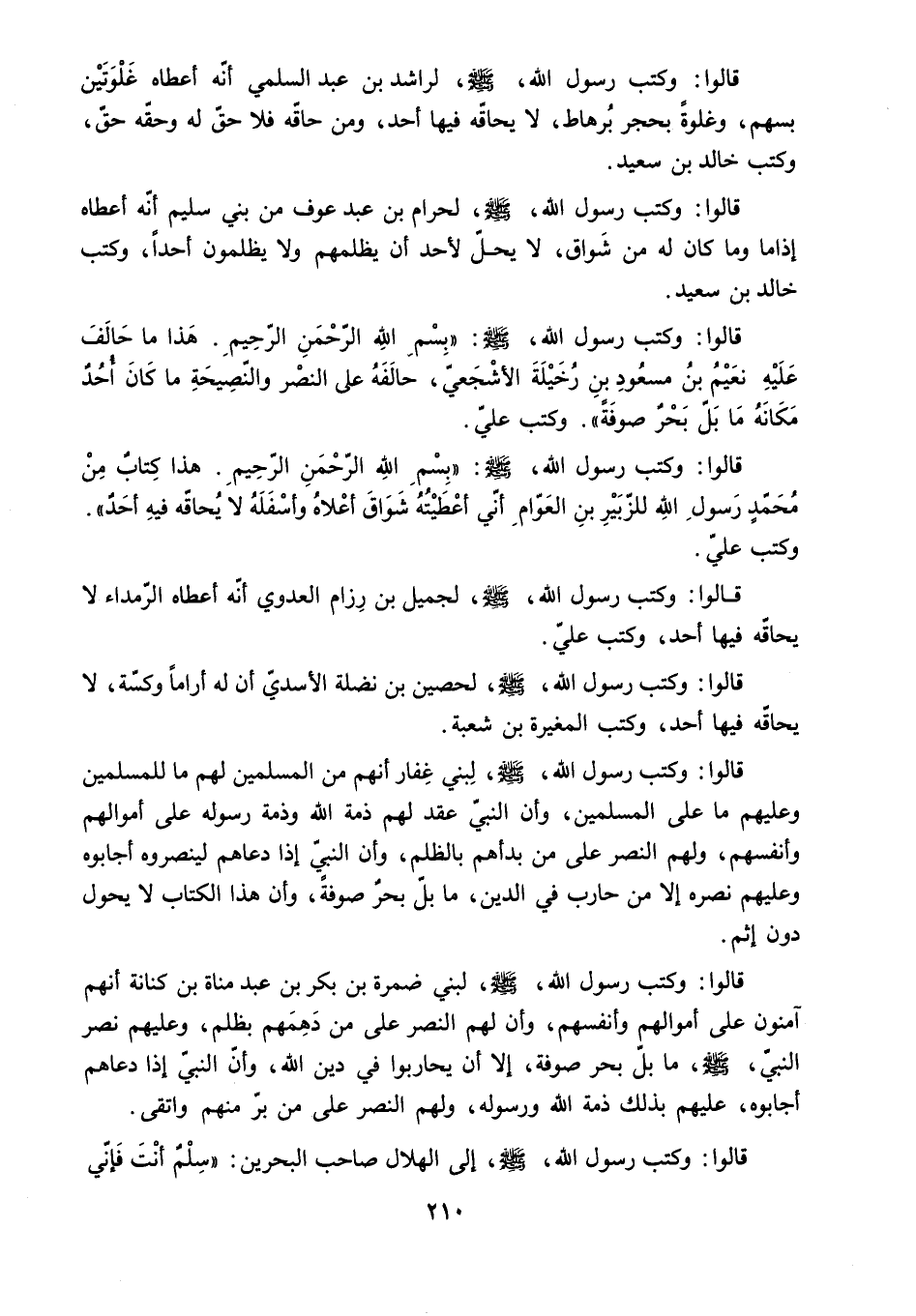 وَكَتَبَ خَالِدُ بْنُ سَعِيدٍ. قَالُوا: وَكَتَبَ رَسُولُ اللَّهِ - صَلَّى اللَّهُ عَلَيْهِ وَسَلَّمَ - لِحَرَامِ بْنِ عَبْدِ عَوْفٍ مِنْ بَنِي سُلَيْمٍ أَنَّهُ أَعْطَاهُ إِذَا مَا وَمَا كَانَ لَهُ مِنْ شَوَاقٍ. لا يَحِلُّ لأَحَدٍ أَنْ يَظْلِمَهُمْ وَلا يَظْلِمُونَ أَحَدًا. وَكَتَبَ خَالِدُ بْنُ سَعِيدٍ.