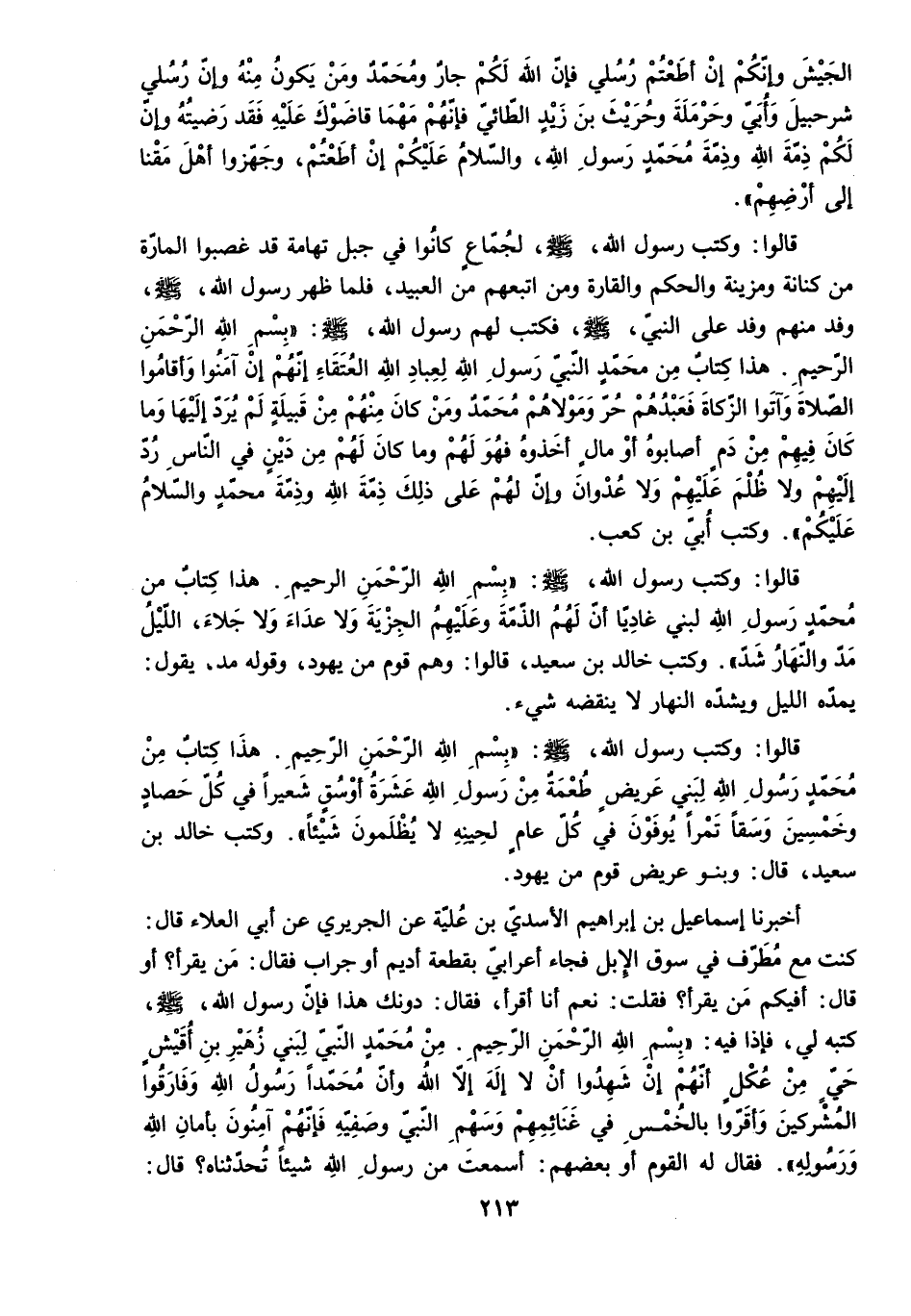 قَالُوا: وَكَتَبَ رَسُولُ الله. ص: بِسْمِ اللَّهِ الرَّحْمَنِ الرَّحِيمِ. هَذَا كِتَابٌ مِنْ مُحَمَّدٍ رَسُولِ اللَّهِ لِبَنِي عَرِيضٍ طُعْمَةٌ مِنْ رسول الله عشرة أَوْسُقٍ شَعِيرًا فِي كُلِّ حَصَادٍ وَخَمْسِينَ وَسَقًا تَمْرًا يُوَفَّوْنَ فِي كُلِّ عَامٍ لِحِينِهِ لا يُظْلَمُونَ شَيْئًا. وَكَتَبَ خَالِدُ بْنُ سَعِيدٍ. قَالَ: وبنو عَرِيضٍ قَوْمٌ مِنْ يَهُودَ.
