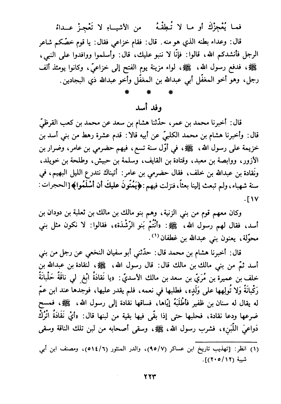 قَالَ: أَخْبَرَنَا مُحَمَّدُ بْنُ عُمَرَ. حَدَّثَنَا هِشَامُ بْنُ سَعْدٍ عَنْ مُحَمَّدِ بْنِ كَعْبٍ الْقُرَظِيِّ قَالَ: وَأَخْبَرَنَا هِشَامُ بْنُ مُحَمَّدٍ الْكَلْبِيُّ عَنْ أَبِيهِ قَالا: قَدِمَ عَشَرَةُ رَهْطٍ مِنْ بَنِي أَسَدِ بْنِ خُزَيْمَةَ على رسول الله - صلى الله عليه وسلم - فِي أَوَّلِ سَنَةِ تِسْعٍ. فِيهِمْ حَضْرَمِيُّ بْنُ عَامِرٍ. وَضِرَارُ بْنُ الأَزْوَرِ. وَوَابِصَةُ بْنُ مَعْبَدٍ. وَقَتَادَةُ بْنُ الْقَايِفِ. وَسَلَمَةُ بْنُ حُبَيْشٍ. وَطَلْحَةُ بْنُ خُوَيْلِدٍ.