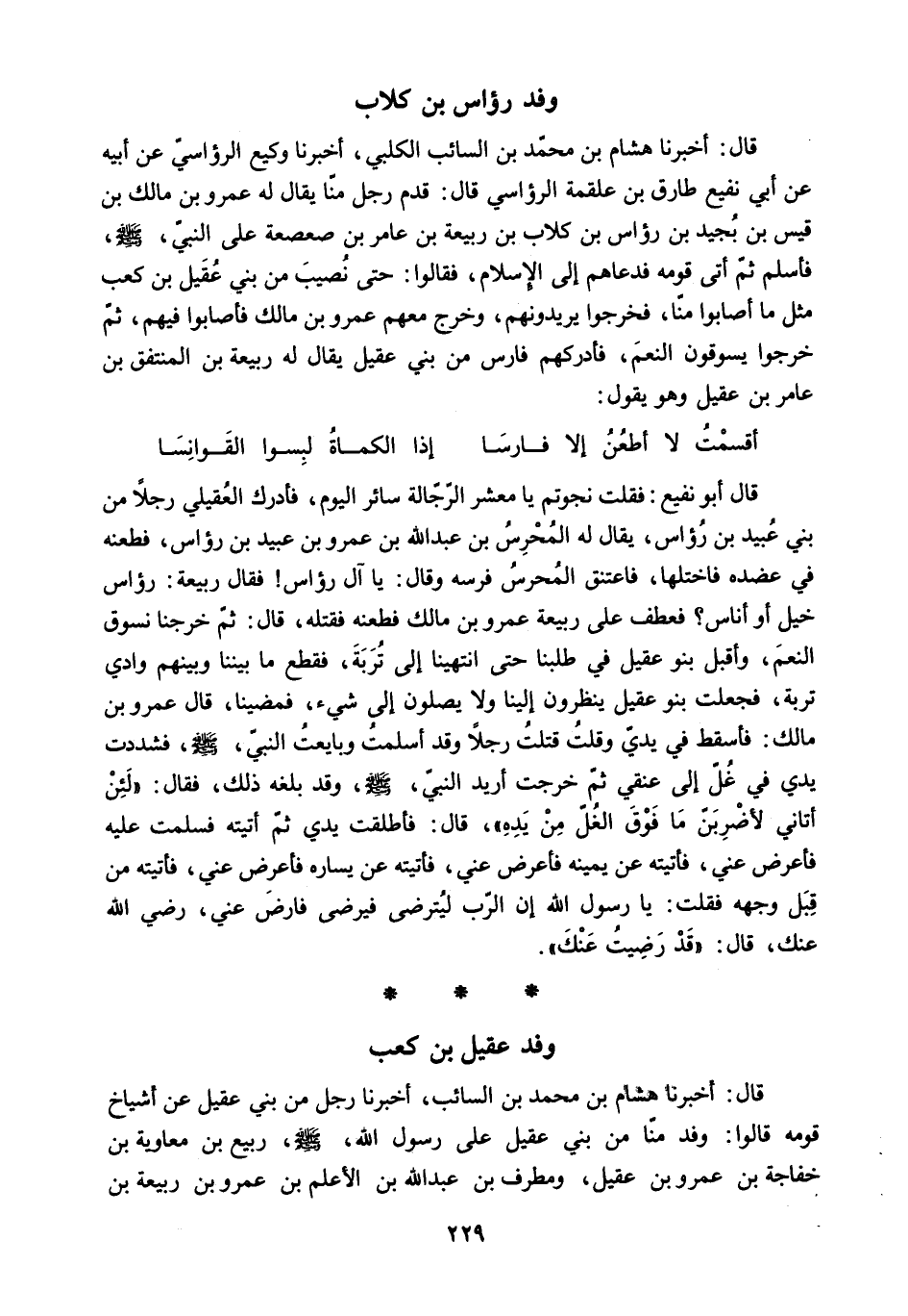 قَالَ: أَخْبَرَنَا هِشَامُ بْنُ مُحَمَّدِ بْنِ السَّائِبِ. أَخْبَرَنَا رَجُلٌ مِنْ بَنِي عَقِيلٍ عَنْ أَشْيَاخِ قَوْمِهِ قَالُوا: وَفَدَ مِنَّا مِنْ بَنِي عَقِيلٍ عَلَى رَسُولِ اللَّهِ - صَلَّى اللَّهُ عَلَيْهِ وَسَلَّمَ - رَبِيعُ بْنُ مُعَاوِيَةَ بْنِ خَفَاجَةَ بْنِ عَمْرِو بْنِ عَقِيلٍ. وَمُطَرِّفُ بْنُ عَبْدِ اللَّهِ بْنِ الأَعْلَمِ بْنِ عَمْرِو بْنِ ربيعة بن