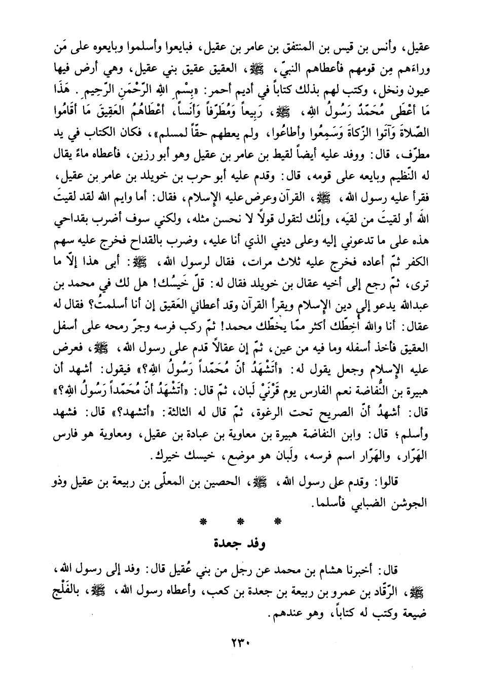 عَقِيلٍ. وَأَنَسُ بْنُ قَيْسِ بْنِ الْمُنْتَفِقِ بْنِ عَامِرِ بْنِ عَقِيلٍ. فَبَايِعُوا وَأَسْلَمُوا وَبَايَعُوهُ عَلَى مَنْ وَرَاءَهُمْ مِنْ قَوْمِهِمْ فَأَعْطَاهُمُ النَّبِيُّ - صَلَّى اللَّهُ عَلَيْهِ وَسَلَّمَ - الْعَقِيقَ عَقِيقَ بَنِي عَقِيلٍ. وَهِيَ أَرْضٌ فِيهَا عُيُونٌ وَنَخْلٌ. وَكَتَبَ لَهُمْ بِذَلِكَ كِتَابًا فِي أَدِيمٍ أَحْمَرَ: بِسْمِ اللَّهِ الرَّحْمَنِ الرَّحِيمِ. هَذَا مَا أَعْطَى مُحَمَّدٌ رَسُولُ اللَّهِ - صَلَّى اللَّهُ عَلَيْهِ وَسَلَّمَ - رَبِيعًا وَمُطَرَّفًا وَأَنَسًا. أَعْطَاهُمُ الْعَقِيقَ مَا أَقَامُوا الصَّلاةَ وَآتَوُا الزَّكَاةَ وَسَمِعُوا وَأَطَاعُوا. وَلَمْ يُعْطِهِمْ حَقًّا لِمُسْلِمٍ. فَكَانَ الْكِتَابُ فِي يَدِ مُطَرِّفٍ. قَالَ: وَوَفَدَ عَلَيْهِ أَيْضًا لَقِيطُ بْنُ عَامِرِ بْنِ عَقِيلٍ وَهُوَ أَبُو رَزِينٍ. فَأَعْطَاهُ مَاءً يُقَالُ لَهُ النَّظِيمُ وَبَايَعَهُ عَلَى قَوْمِهِ. قَالَ: وَقَدِمَ عَلَيْهِ أَبُو حَرْبِ بْنُ خُوَيْلِدِ بْنِ عَامِرِ بْنِ عَقِيلٍ. فَقَرَأَ عَلَيْهِ رَسُولُ اللَّهِ - صَلَّى اللَّهُ عَلَيْهِ وَسَلَّمَ - الْقُرْآنَ وَعَرَضَ عَلَيْهِ الإِسْلامَ. فَقَالَ: أَمَا وَايْمُ اللَّهِ لَقَدْ لَقِيتَ اللَّهَ أَوْ لَقِيتَ مَنْ لَقِيَهُ. وَإِنَّكَ لَتَقُولُ قَوْلا لا نُحْسِنُ مِثْلَهُ. وَلَكِنِّي سَوْفَ أَضْرِبُ بِقِدَاحِي هَذِهِ عَلَى مَا تَدْعُونِي إِلَيْهِ وَعَلَى دِينِي الَّذِي أَنَا عَلَيْهِ. وَضَرَبَ بِالْقِدَاحِ فَخَرَجَ عَلَيْهِ سَهْمُ الْكُفْرِ ثُمَّ أَعَادَهُ فَخَرَجَ عَلَيْهِ ثَلاثَ مَرَّاتٍ. فقال لرسول الله. ص: أَبَى هَذَا إِلا مَا تَرَى. ثُمَّ رَجَعَ إِلَى أَخِيهِ عِقَالِ بْنِ خُوَيْلِدٍ فَقَالَ لَهُ: قَلَّ خَيْسُكَ! هَلْ لَكَ فِي مُحَمَّدِ بْنِ عَبْدِ اللَّهِ يَدْعُو إِلَى دِينِ الإِسْلامِ وَيَقْرَأُ الْقُرْآنَ وَقَدْ أَعْطَانِي الْعَقِيقَ إِنْ أَنَا أَسْلَمْتُ؟ فَقَالَ لَهُ عِقَالٌ: أَنَا وَاللَّهِ أُخِطُّكَ أَكْثَرَ مِمَّا يُخِطُّكَ مُحَمَّدٌ! ثُمَّ رَكِبَ فَرَسَهُ وَجَرَّ رُمْحَهُ عَلَى أَسْفَلِ الْعَقِيقِ فَأَخَذَ أَسْفَلَهُ وَمَا فِيهِ مِنْ عَيْنٍ. ثُمَّ إِنَّ عِقَالا قَدِمَ عَلَى رَسُولِ اللَّهِ - صَلَّى اللَّهُ عَلَيْهِ وسلم - فَعَرَضَ عَلَيْهِ الإِسْلامَ وَجَعَلَ يَقُولُ لَهُ: [أَتَشْهَدُ أَنَّ مُحَمَّدًا رَسُولُ اللَّهِ؟ فَيَقُولُ: أَشْهَدُ أَنَّ هُبَيْرَةَ بْنَ النُّفَاضَةِ نِعْمَ الْفَارِسُ يَوْمَ قَرْنَيْ لَبَانٍ. ثُمَّ قَالَ: أَتَشْهَدُ أَنَّ مُحَمَّدًا رَسُولُ اللَّهِ؟ قَالَ: أَشْهَدُ أَنَّ الصَّرِيحَ تَحْتَ الرَّغْوَةِ. ثُمَّ قَالَ لَهُ الثَّالِثَةَ: أَتَشْهَدُ؟] قَالَ: فَشَهِدَ وَأَسْلَمَ. قَالَ: وَابْنُ النُّفَاضَةِ هُبَيْرَةُ بْنُ مُعَاوِيَةَ بْنِ عُبَادَةِ بْنِ عَقِيلٍ. وَمُعَاوِيَةُ هُوَ فَارِسُ الْهَرَّارِ. وَالْهَرَّارُ اسْمُ فَرَسِهِ. وَلَبَانٌ هُوَ مَوْضِعٌ. خَيْسُكَ خَيْرُكَ. قَالُوا: وَقَدِمَ عَلَى رَسُولِ اللَّهِ - صَلَّى اللَّهُ عَلَيْهِ وَسَلَّمَ - الْحُصَيْنُ بْنُ الْمُعَلَّى بْنِ رَبِيعَةَ بْنِ عَقِيلٍ وَذُو الْجَوْشَنِ الضِّبَابِيُّ فَأَسْلَمَا.