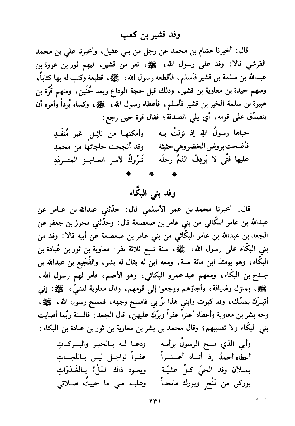 ص. بِمَنْزِلٍ وَضِيَافَةٍ. وَأَجَازَهُمْ وَرَجَعُوا إِلَى قَوْمِهِمْ. وَقَالَ معاوية للنبي. ص: إِنِّي أَتَبَرَّكُ بِمَسِّكَ. وَقَدْ كَبِرْتُ وَابْنِي هَذَا بَرٌّ بِي فَامْسَحْ وَجْهَهُ. فَمَسَحَ رَسُولُ اللَّهِ - صَلَّى اللَّهُ عَلَيْهِ وَسَلَّمَ -
