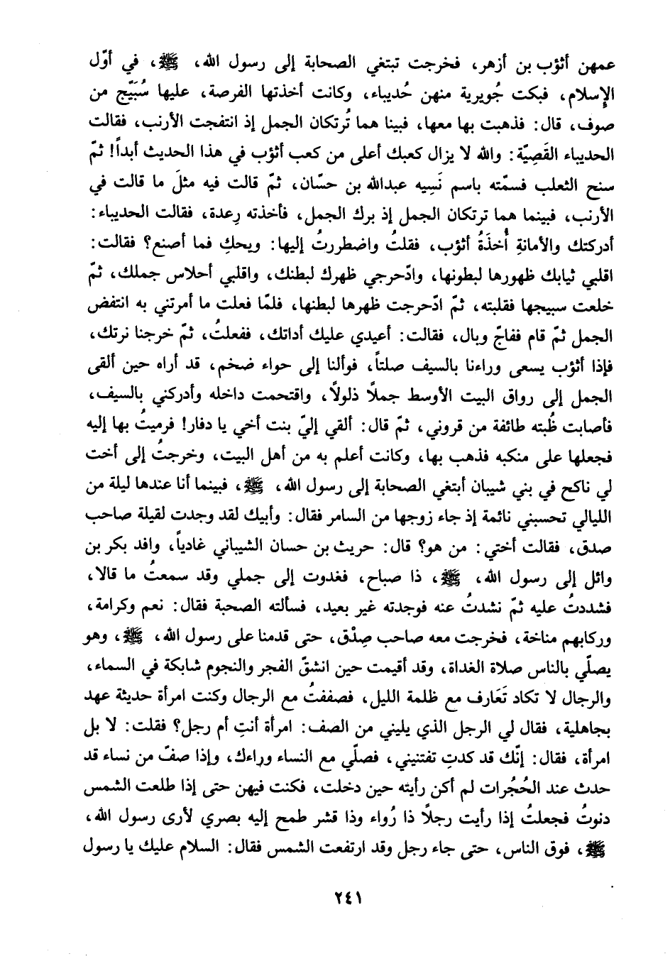 وَالرِّجَالُ لا تَكَادُ تَعَارَفُ مَعَ ظُلْمَةِ اللَّيْلِ. فَصَفَفْتُ مَعَ الرِّجَالِ وَكُنْتُ امْرَأَةً حَدِيثَةَ عَهْدٍ بِجَاهِلِيَّةٍ. فَقَالَ لِي الرَّجُلُ الَّذِي يَلِينِي مِنَ الصَّفِّ: امْرَأَةٌ أَنْتِ أَمْ رَجُلٌ؟ فَقُلْتُ: لا بَلِ امْرَأَةٌ. فَقَالَ: إِنَّكِ قَدْ كِدْتِ تَفْتِنِينِي. فَصَلِّي مَعَ النِّسَاءِ وَرَاءَكَ. وَإِذَا صَفٌّ مِنْ نِسَاءٍ قَدْ حَدَثَ عِنْدَ الْحُجُرَاتِ لَمْ أَكُنْ رَأَيْتُهُ حِينَ دَخَلْتُ. فَكُنْتُ فِيهِنَّ حَتَّى إِذَا طَلَعَتِ الشَّمْسُ دَنَوْتُ فَجَعَلْتُ إِذَا رَأَيْتُ رَجُلا ذَا رُوَاءٍ وَذَا قِشْرٍ طَمَحَ إِلَيْهِ بَصَرِي لأَرَى رَسُولَ الله.