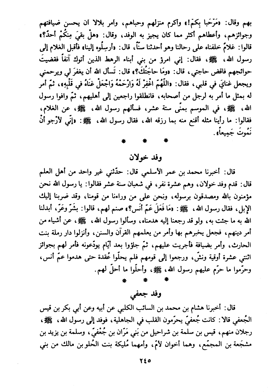 [قَالَ: أَخْبَرَنَا مُحَمَّدُ بْنُ عُمَرَ الأَسْلَمِيُّ قَالَ: حَدَّثَنِي غَيْرُ وَاحِدٍ مِنْ أَهْلِ الْعِلْمِ قَالَ: قَدِمَ وَفْدُ خَوْلانَ. وَهُمْ عَشَرَةُ نَفَرٍ. فِي شَعْبَانَ سَنَةَ عَشْرٍ فَقَالُوا: يَا رَسُولَ اللَّهِ نَحْنُ مُؤْمِنُونَ بِاللَّهِ وَمُصَدِّقُونَ بِرَسُولِهِ. وَنَحْنُ عَلَى مَنْ وَرَاءَنَا مِنْ قَوْمِنَا. وَقَدْ ضَرَبْنَا إِلَيْكَ الإبل. فقال رسول الله. ص: مَا فَعَلَ عَمُّ أَنَسٍ؟ صَنَمٌ لَهُمْ. قَالُوا: بِشَرٍّ وَعْرٍ. أَبْدَلَنَا اللَّهُ بِهِ مَا جِئْتَ بِهِ. وَلَوْ قَدْ رَجَعْنَا إِلَيْهِ هَدَمْنَاهُ. وَسَأَلُوا رَسُولُ اللَّهِ - صَلَّى اللَّهُ عَلَيْهِ وَسَلَّمَ - عَنْ أَشْيَاءَ مِنْ أَمْرِ دِينِهِمْ. فَجَعَلَ يُخْبِرُهُمْ بِهَا وَأَمَرَ مَنْ يُعَلِّمُهُمُ الْقُرْآنَ وَالسُّنَنَ. وَأُنْزِلُوا دَارَ رَمْلَةَ بِنْتِ الْحَارِثِ. وَأَمَرَ بِضِيَافَةٍ فَأُجْرِيَتْ عَلَيْهِمْ. ثم جاؤوا بَعْدَ أَيَّامٍ يُوَدِّعُونَهُ فَأَمَرَ لَهُمْ بِجَوَائِزَ اثْنَتَيْ عَشْرَةَ أُوقِيَّةً وَنَشٍّ. وَرَجَعُوا إِلَى قَوْمِهِمْ فَلَمْ يَحِلُّوا عُقْدَةً حَتَّى هَدَمُوا عَمَّ أَنَسٍ.