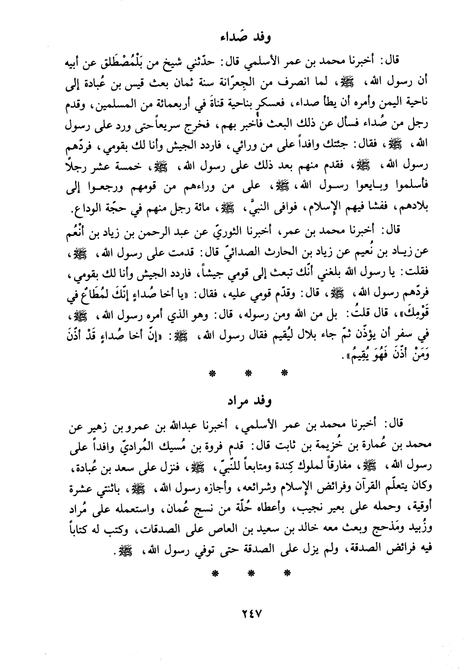 قَالَ: أَخْبَرَنَا مُحَمَّدُ بْنُ عُمَرَ الأَسْلَمِيُّ قَالَ: حدثني شيخ من بلمصطلق عَنْ أَبِيهِ أَنَّ رَسُولَ اللَّهِ - صَلَّى اللَّهُ عَلَيْهِ وَسَلَّمَ - لَمَّا انْصَرَفَ مِنَ الْجِعْرَانَةِ سَنَةَ ثَمَانٍ بَعَثَ قَيْسَ بْنَ عُبَادَةَ إِلَى نَاحِيَةِ الْيَمَنِ وَأَمَرَهُ أَنْ يَطَأَ صُدَاءَ. فَعَسْكَرَ بِنَاحِيَةِ قَنَاةَ فِي أَرْبَعِمِائَةٍ مِنَ الْمُسْلِمِينَ. وَقَدِمَ رَجُلٌ مِنْ صُدَاءَ فَسَأَلَ عَنْ ذَلِكَ الْبَعْثِ فَأُخْبِرَ بِهِمْ. فَخَرَجَ سَرِيعًا حَتَّى وَرَدَ عَلَى رَسُولِ اللَّهِ - صَلَّى اللَّهُ عَلَيْهِ وَسَلَّمَ - فَقَالَ: جِئْتُكَ وَافِدًا عَلَى مَنْ وَرَائِي. فَارْدُدِ الْجَيْشَ وَأَنَا لَكَ بِقَوْمِي. فَرَدَّهُمْ رَسُولُ اللَّهِ - صَلَّى اللَّهُ عَلَيْهِ وَسَلَّمَ - فَقَدِمَ مِنْهُمْ بَعْدَ ذَلِكَ عَلَى رسول الله - صلى الله عليه وسلم - خمسة عَشَرَ رَجُلا فَأَسْلَمُوا وَبَايَعُوا رَسُولَ اللَّهِ - صَلَّى اللَّهُ عَلَيْهِ وَسَلَّمَ - عَلَى مَنْ وَرَاءَهُمْ مِنْ قَوْمِهِمْ وَرَجَعُوا إِلَى بِلادِهِمْ. فَفَشَا فِيهِمُ الإِسْلامُ. فَوَافَى النَّبِيَّ - صَلَّى اللَّهُ عَلَيْهِ وَسَلَّمَ - مِائَةُ رَجُلٍ مِنْهُمْ فِي حَجَّةِ الْوَدَاعِ.