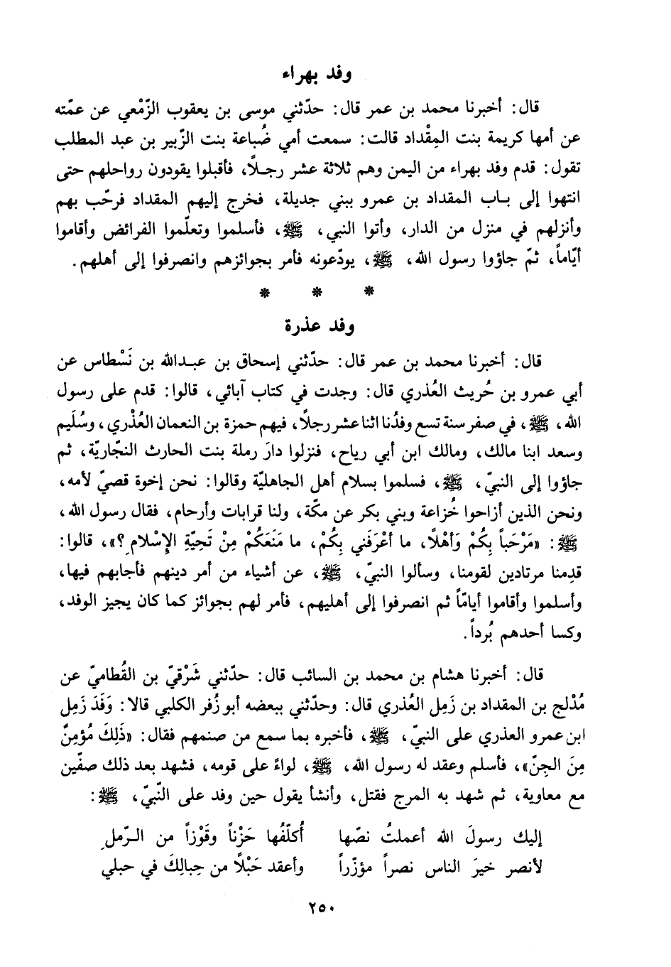 قَالَ: أَخْبَرَنَا مُحَمَّدُ بْنُ عُمَرَ قَالَ: حَدَّثَنِي مُوسَى بْنُ يَعْقُوبَ الزَّمْعِيُّ عَنْ عَمَّتِهِ عَنْ أُمِّهَا كَرِيمَةَ بِنْتِ الْمِقْدَادِ قَالَتْ: سَمِعْتُ أُمِّي ضُبَاعَةَ بِنْتَ الزُّبَيْرِ بْنِ عَبْدِ الْمُطَّلِبِ تَقُولُ: قَدِمَ وَفْدُ بَهْرَاءَ مِنَ الْيَمَنِ وَهُمْ ثَلاثَةَ عَشَرَ رَجُلا. فَأَقْبَلُوا يَقُودُونَ رَوَاحِلَهُمْ حَتَّى انْتَهَوْا إِلَى بَابِ الْمِقْدَادِ بْنِ عَمْرٍو بِبَنِي جَدِيلَةَ. فَخَرَجَ إِلَيْهِمُ الْمِقْدَادُ فَرَحَّبَ بِهِمْ وَأَنْزَلَهُمْ فِي مَنْزِلٍ مِنَ الدَّارِ. وَأَتَوُا النَّبِيَّ - صَلَّى اللَّهُ عَلَيْهِ وَسَلَّمَ - فَأَسْلَمُوا وَتَعَلَّمُوا الْفَرَائِضَ وأقاموا أياما. ثم جاؤوا رَسُولَ اللَّهِ - صَلَّى اللَّهُ عَلَيْهِ وَسَلَّمَ - يُوَدِّعُونَهُ فَأَمَرَ بِجَوَائِزِهِمْ وَانْصَرَفُوا إِلَى أَهْلِهِمْ.