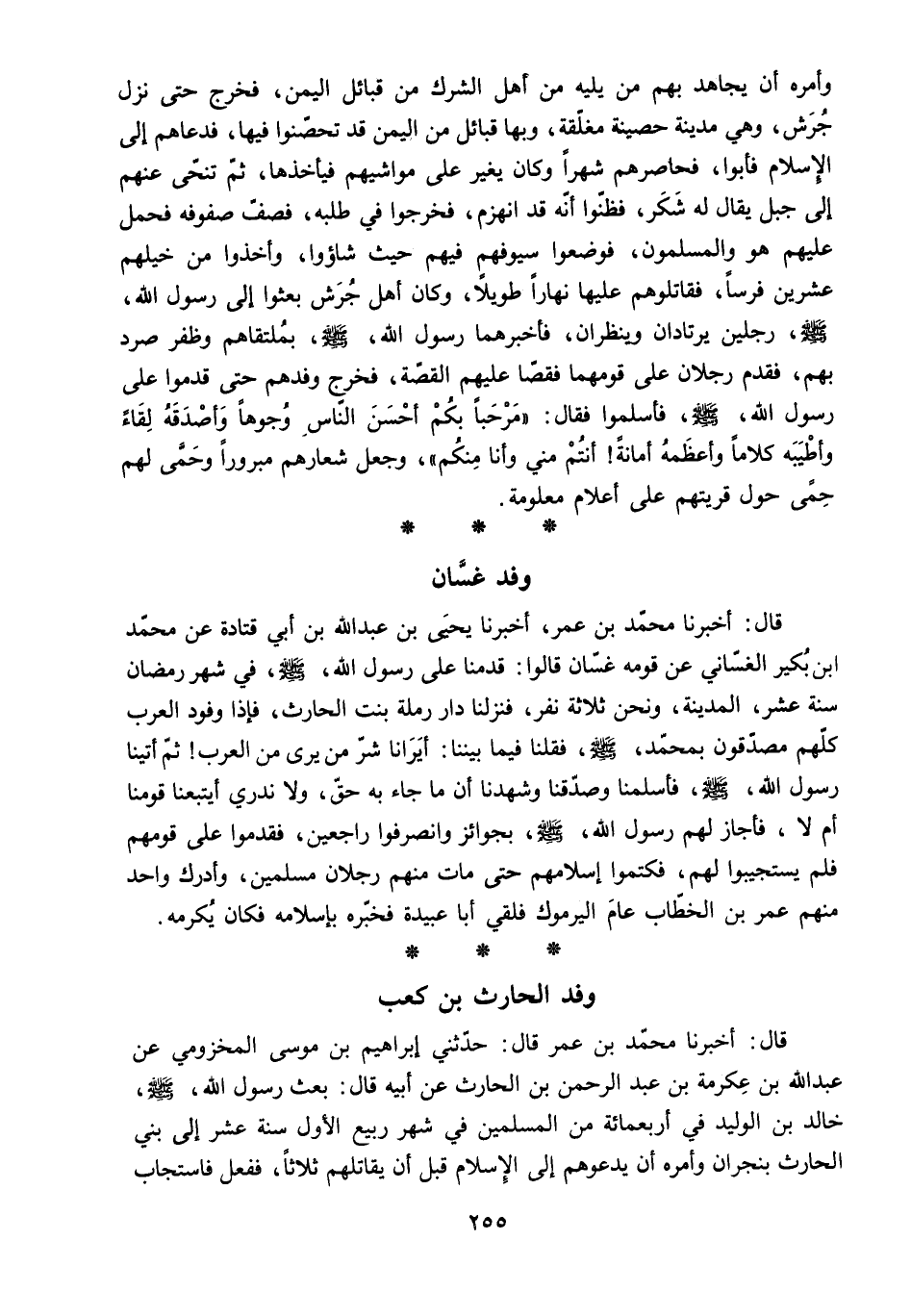 قَالَ: أَخْبَرَنَا مُحَمَّدُ بْنُ عُمَرَ. أَخْبَرَنَا يَحْيَى بْنُ عَبْدِ اللَّهِ بْنِ أَبِي قَتَادَةَ عَنْ مُحَمَّدِ ابن بُكَيْرٍ الْغَسَّانِيِّ عَنْ قَوْمِهِ غَسَّانَ قَالُوا: قَدِمْنَا عَلَى رَسُولِ اللَّهِ - صَلَّى اللَّهُ عَلَيْهِ وسلم - فِي شَهْرِ رَمَضَانَ سَنَةَ عَشْرٍ. الْمَدِينَةَ. وَنَحْنُ ثَلاثَةُ نَفَرٍ. فَنَزَلْنَا دَارَ رَمْلَةَ بِنْتِ الْحَارِثِ. فَإِذَا وُفُودُ الْعَرَبِ كُلُّهُمْ مُصَدِّقُونَ بِمُحَمَّدٍ - صَلَّى اللَّهُ عَلَيْهِ وَسَلَّمَ - فَقُلْنَا فِيمَا بَيْنَنَا: أَيَرَانَا شَرَّ مَنْ يَرَى مِنَ الْعَرَبِ! ثُمَّ أَتَيْنَا رَسُولَ اللَّهِ - صَلَّى اللَّهُ عَلَيْهِ وَسَلَّمَ - فَأَسْلَمْنَا وَصَدَّقْنَا وَشَهِدْنَا أَنَّ مَا جَاءَ بِهِ حَقٌّ. وَلا نَدْرِي أَيَتْبَعُنَا قَوْمُنَا أَمْ لا. فَأَجَازَ لَهُمْ رَسُولُ اللَّهِ - صَلَّى اللَّهُ عَلَيْهِ وَسَلَّمَ - بِجَوَائِزَ وَانْصَرَفُوا رَاجِعِينَ. فَقَدِمُوا عَلَى قَوْمِهِمْ فَلَمْ يَسْتَجِيبُوا لَهُمْ. فَكَتَمُوا إِسْلامَهُمْ حَتَّى مَاتَ مِنْهُمْ رَجُلانِ مُسْلِمَيْنِ. وَأَدْرَكَ وَاحِدٌ مِنْهُمْ عُمَرَ بْنَ الْخَطَّابِ عَامَ الْيَرْمُوكِ فَلَقِيَ أَبَا عُبَيْدَةَ فَخَبَّرَهُ بِإِسْلامِهِ فَكَانَ يُكْرِمُهُ.