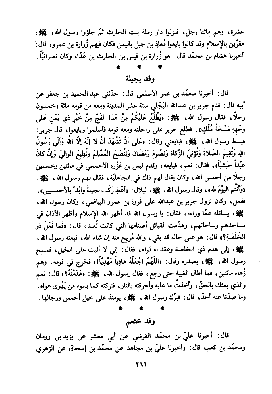 قَالَ: أَخْبَرَنَا مُحَمَّدُ بْنُ عُمَرَ الأَسْلَمِيُّ قَالَ: حَدَّثَنِي عَبْدُ الْحَمِيدِ بْنُ جَعْفَرٍ عَنْ أَبِيهِ قَالَ: قَدِمَ جَرِيرُ بْنُ عَبْدِ اللَّهِ الْبَجَلِيُّ سَنَةَ عَشْرٍ الْمَدِينَةَ وَمَعَهُ مِنْ قَوْمِهِ مِائَةٌ وَخَمْسُونَ رَجُلا. [فَقَالَ رَسُولُ الله. ص: يَطْلُعُ عَلَيْكُمْ مِنْ هَذَا الْفَجِّ مِنْ خَيْرِ ذِي يَمَنٍ عَلَى وَجْهِهِ مَسْحَةُ مَلَكٍ. فَطَلَعَ جَرِيرٌ عَلَى رَاحِلَتِهِ وَمَعَهُ قَوْمُهُ فَأَسْلَمُوا وَبَايَعُوا. قَالَ جَرِيرٌ: