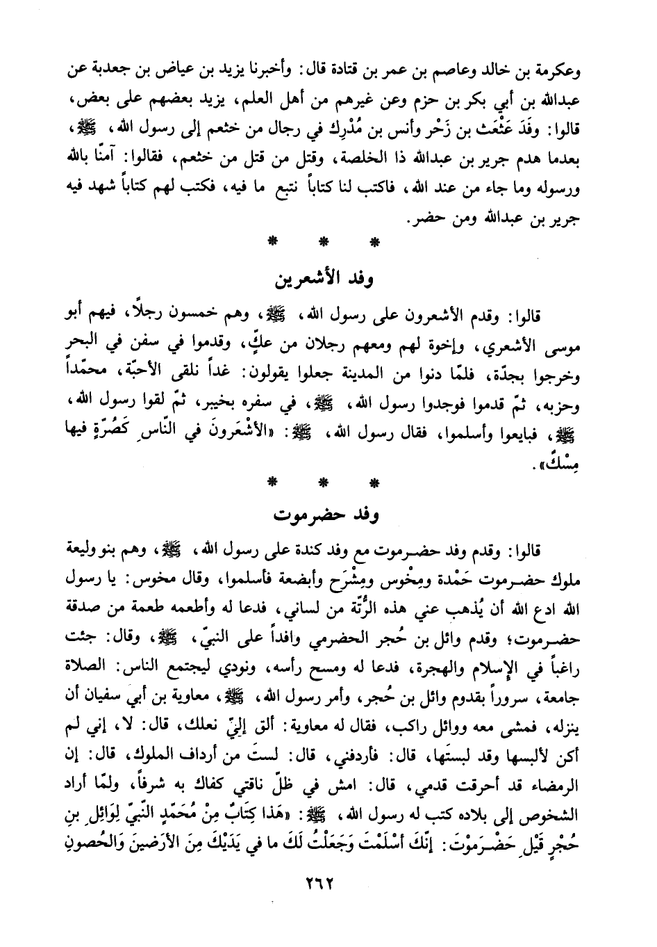 قَالُوا: وقدم وفد حضرموت مَعَ وفد كندة عَلَى رَسُول اللَّهِ - صَلَّى اللَّهُ عَلَيْهِ وَسَلَّمَ - وهم بنو وليعة ملوك حضرموت حمدة ومخوس ومشرح وأبضعة فأسلموا. وَقَالَ مخوس: يا رسول اللَّه ادع اللَّه أن يذهب عني هذه الرتة مِن لساني. فدعا لَهُ وأطعمه طعمة مِن صدقة حضرموت. وقدم وائل بْن حجر الحضرمي وافدا عَلَى النَّبِيّ - صَلَّى اللَّهُ عَلَيْهِ وَسَلَّمَ - وَقَالَ: جئت راغبا فِي الْإِسْلَام والهجرة. فدعا لَهُ ومسح رأسه. ونودي ليجتمع الناس: الصلاة جامعة. سرورا بقدوم وائل بْن حجر. وَأَمَرَ رَسُول اللَّهِ - صَلَّى اللَّهُ عَلَيْهِ وَسَلَّمَ - معاوية بْن أَبِي سُفْيَان أن ينزله. فمشى معه ووائل راكب. فَقَالَ لَهُ معاوية: ألق إلي نعلك. قَالَ: لا. إني لم أكن لألبسها وقد لبستها. قَالَ: فأردفني. قَالَ: لست مِن أرداف الملوك. قَالَ: إن الرمضاء قد أحرقت قدمي. قَالَ: امش فِي ظل ناقتي كفاك بِهِ شرفا. ولما أراد الشخوص إلى بلاده كتب له رسول الله. ص: هذا كتاب من محمد النبي لوائل بن حجر قِيلَ حضرموت: إنك أسلمت وجعلت لك ما فِي يديك مِن الأرضين والحصون