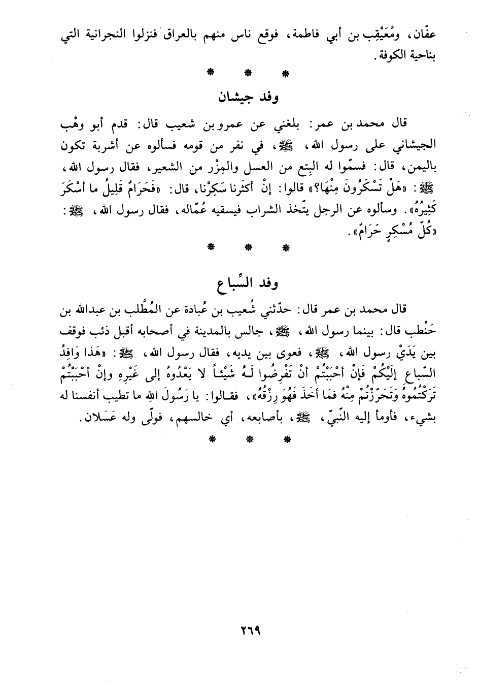 ص: هَلْ تَسْكَرُونَ مِنْهَا؟ قَالُوا: إِنْ أَكْثَرْنَا سَكِرْنَا. قَالَ: فَحَرَامٌ قَلِيلُ مَا أَسْكَرَ كَثِيرُهُ. وَسَأَلُوهُ عَنِ الرَّجُلِ يَتَّخِذُ الشَّرَابَ فَيَسْقِيهِ عُمَّالَهُ. فَقَالَ رسول الله. ص: