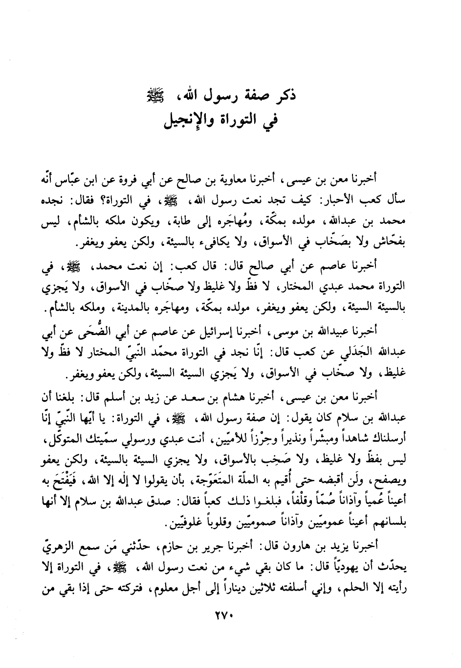 لَيْسَ بِفَظٍّ وَلا غَلِيظٍ. وَلا صَخِبٍ بِالأَسْوَاقِ. وَلا يَجْزِي السَّيِّئَةَ بِالسَّيِّئَةِ. وَلَكِنْ يَعْفُو وَيَصْفَحُ. وَلَنْ أَقْبِضَهُ حَتَّى أُقِيمَ بِهِ الْمِلَّةَ الْمُتَعَوِّجَةَ. بِأَنْ يَقُولُوا لا إِلَهَ إِلا اللَّهُ. فَيَفْتَحَ بِهِ أَعْيُنًا عُمْيًا وَآذَانًا صُمًّا وَقُلْفًا. فَبَلَّغُوا ذَلِكَ كَعْبًا فَقَالَ: صَدَقَ عَبْدُ اللَّهِ بْنُ سَلامٍ أَلا إِنَّهَا بِلِسَانِهِمْ أَعْيُنًا عَمُومِيِّينَ وَآذَانًا صَمُومِيِّينَ وَقُلُوبًا غَلُوفِيِّينَ.