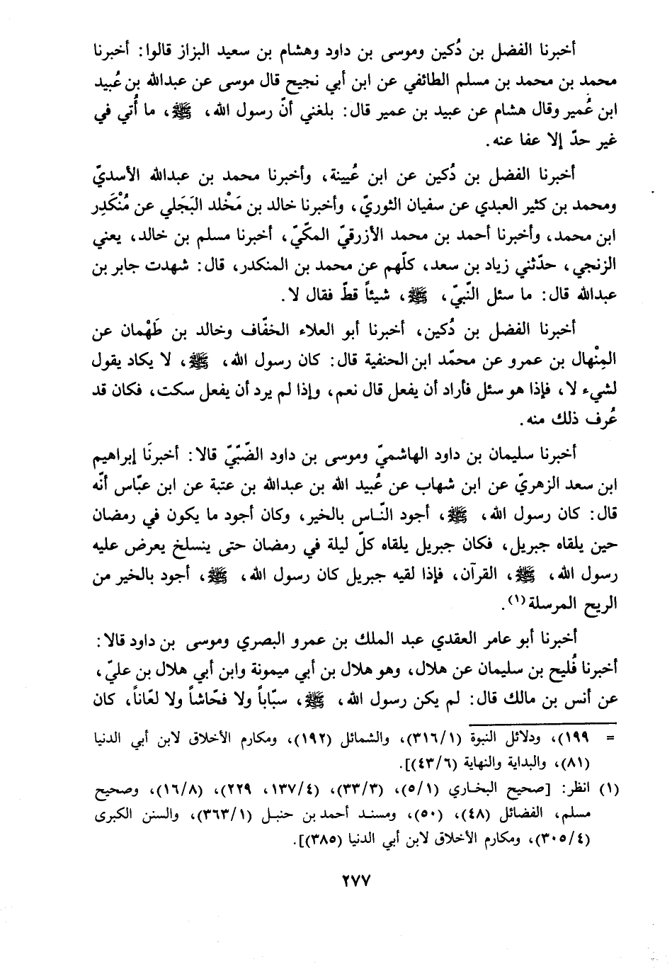 أَخْبَرَنَا الْفَضْلُ بْنُ دُكَيْنٍ عَنِ ابْنِ عُيَيْنَةَ. وَأَخْبَرَنَا مُحَمَّدُ بْنُ عَبْدِ اللَّهِ الأَسَدِيُّ وَمُحَمَّدُ بْنُ كَثِيرٍ الْعَبْدِيُّ عَنْ سُفْيَانَ الثَّوْرِيِّ. وَأَخْبَرَنَا خالد بن مخلد البجلي عن منكدر ابن مُحَمَّدٍ. وَأَخْبَرَنَا أَحْمَدُ بْنُ مُحَمَّدٍ الأَزْرَقِيُّ الْمَكِّيُّ. أَخْبَرَنَا مُسْلِمُ بْنُ خَالِدٍ. يَعْنِي الزَّنْجِيَّ. حَدَّثَنِي زِيَادُ بْنُ سَعْدٍ. كُلُّهُمْ عَنْ مُحَمَّدِ بْنِ الْمُنْكَدِرِ. قَالَ: شَهِدْتُ جَابِرَ بْنَ عَبْدِ اللَّهِ قَالَ: مَا سُئِلَ النَّبِيُّ - صَلَّى اللَّهُ عَلَيْهِ وَسَلَّمَ - شَيْئًا قَطُّ فَقَالَ لا.
