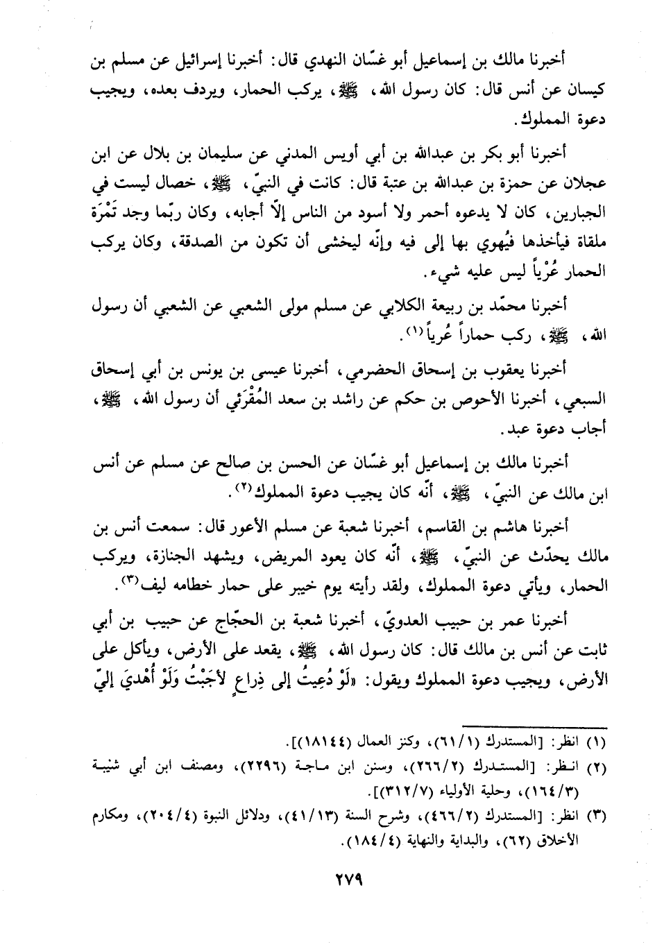 أَخْبَرَنَا مَالِكُ بْنُ إِسْمَاعِيلَ أَبُو غَسَّانَ النَّهْدِيُّ قَالَ: أَخْبَرَنَا إِسْرَائِيلُ عَنْ مُسْلِمِ بْنِ كَيْسَانَ عَنْ أَنَسٍ قَالَ: كَانَ رَسُولُ اللَّهِ - صَلَّى اللَّهُ عَلَيْهِ وَسَلَّمَ - يَرْكَبُ الْحِمَارَ. وَيُرْدِفُ بَعْدَهُ. وَيُجِيبُ دَعْوَةَ الْمَمْلُوكِ.