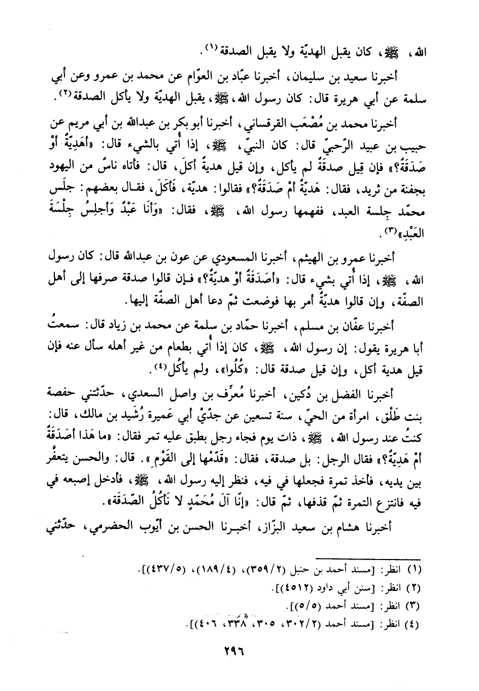 [أَخْبَرَنَا عَفَّانُ بْنُ مُسْلِمٍ. أَخْبَرَنَا حَمَّادُ بْنُ سَلَمَةَ عَنْ مُحَمَّدِ بْنِ زِيَادٍ قَالَ: سَمِعْتُ أَبَا هُرَيْرَةَ يَقُولُ: إِنَّ رَسُولَ اللَّهِ - صَلَّى اللَّهُ عَلَيْهِ وَسَلَّمَ - كَانَ إِذَا أُتِيَ بِطَعَامٍ مِنْ غَيْرِ أَهْلِهِ سَأَلَ عَنْهُ فَإِنْ قِيلَ هَدِيَّةٌ أَكَلَ. وَإِنْ قِيلَ صَدَقَةٌ قَالَ: كُلُوا. وَلَمْ يَأْكُلْ] «4» .